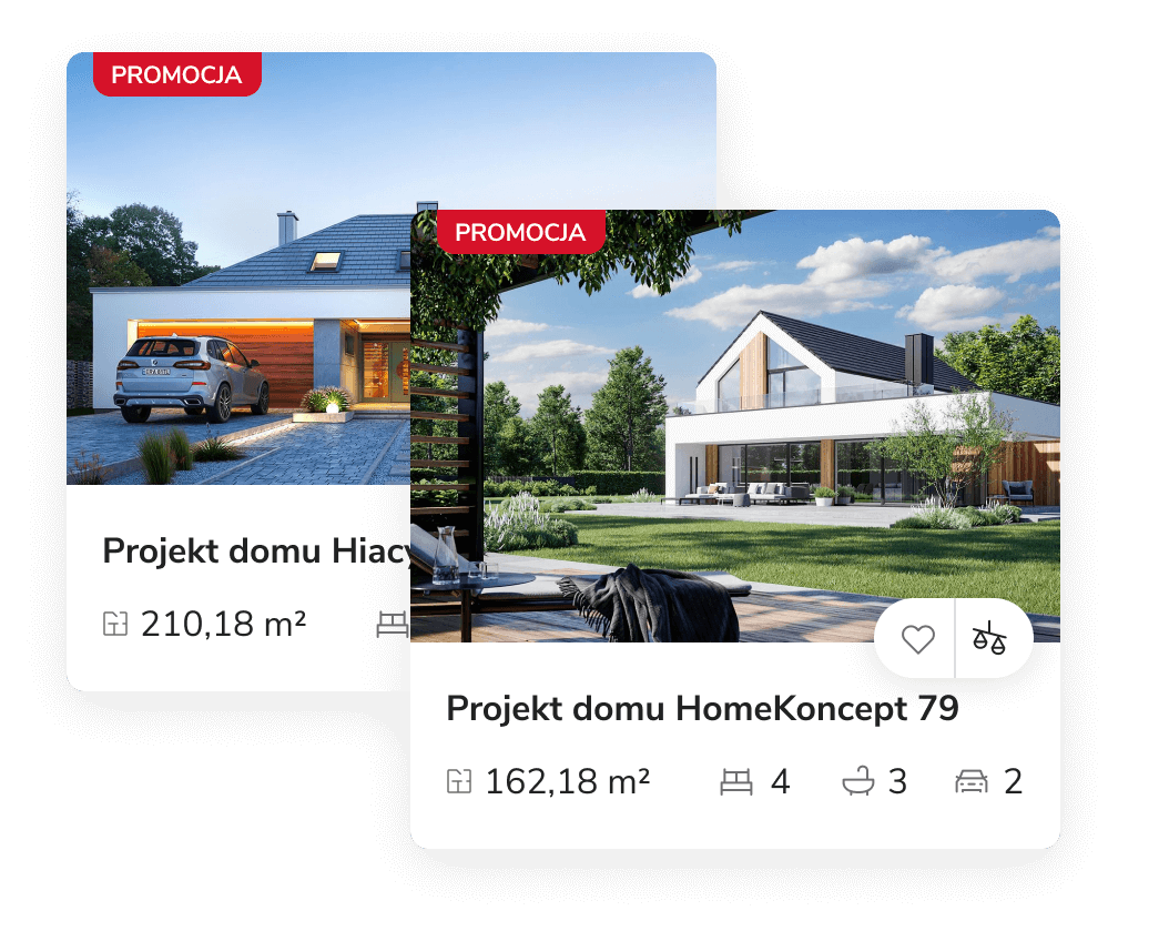 Wyselekcjonowane projekty domów można porównać ze sobą dzięki przygotowanej porównywarce projektów. Aby dodać projekt domu do porównania, kliknij w ikonę wagi na karcie projektu. Jednocześnie możesz zestawić ze sobą kilka projektów, co ułatwi Ci podjęcie decyzję o wyborze domu idealnego.