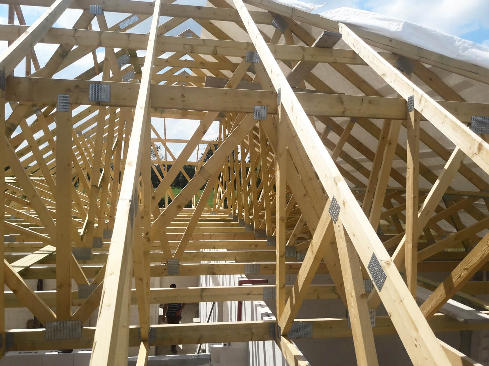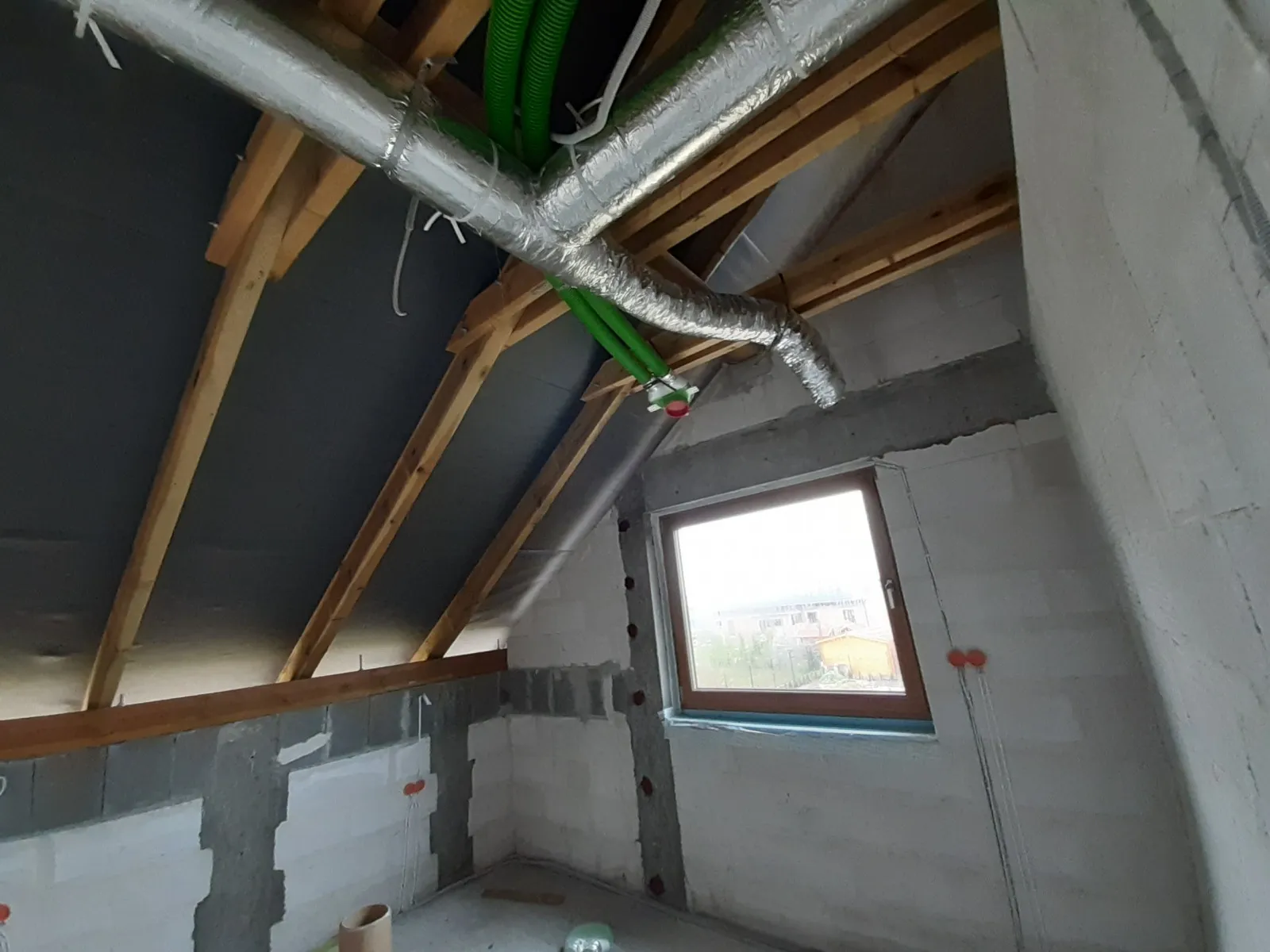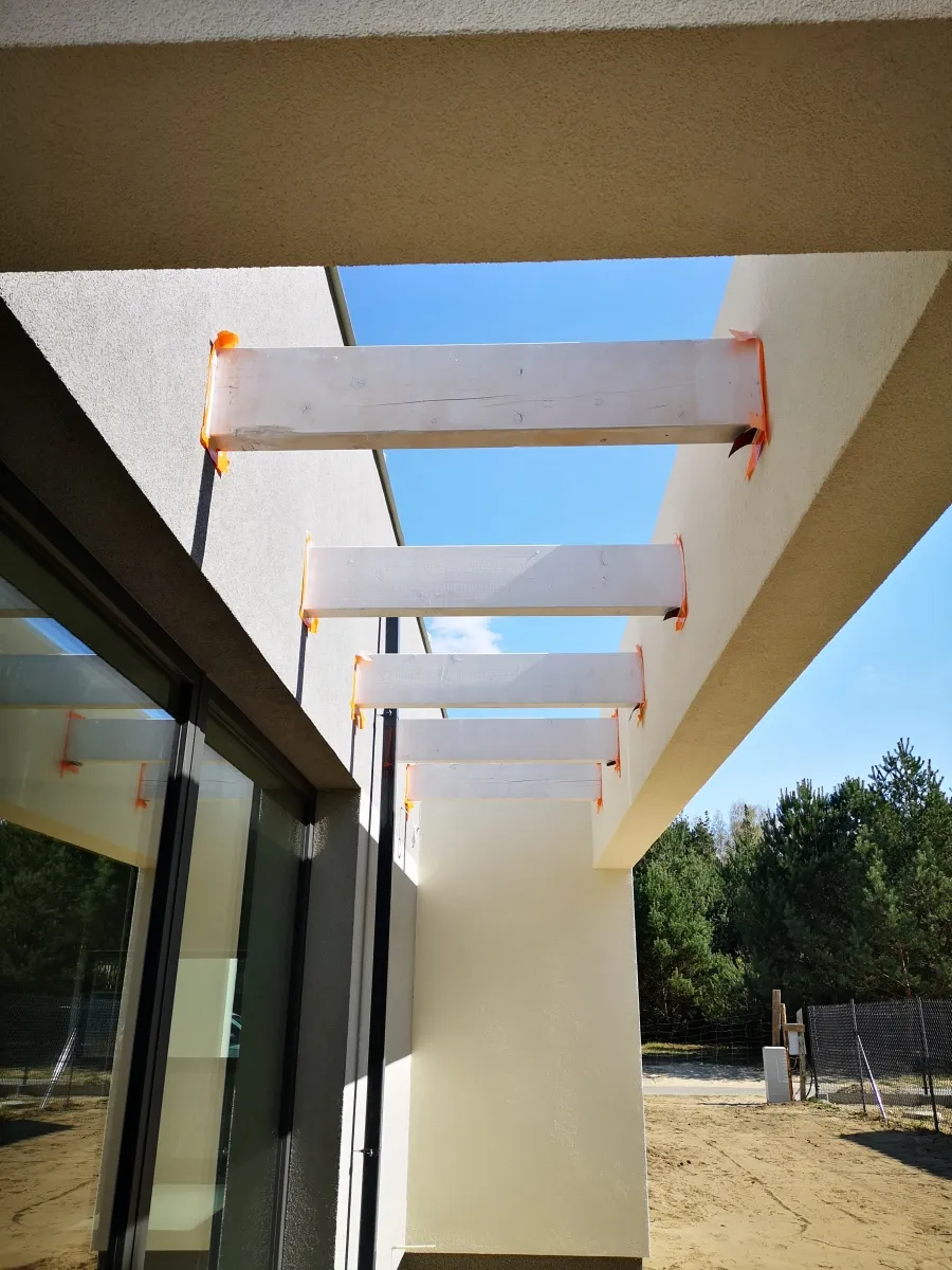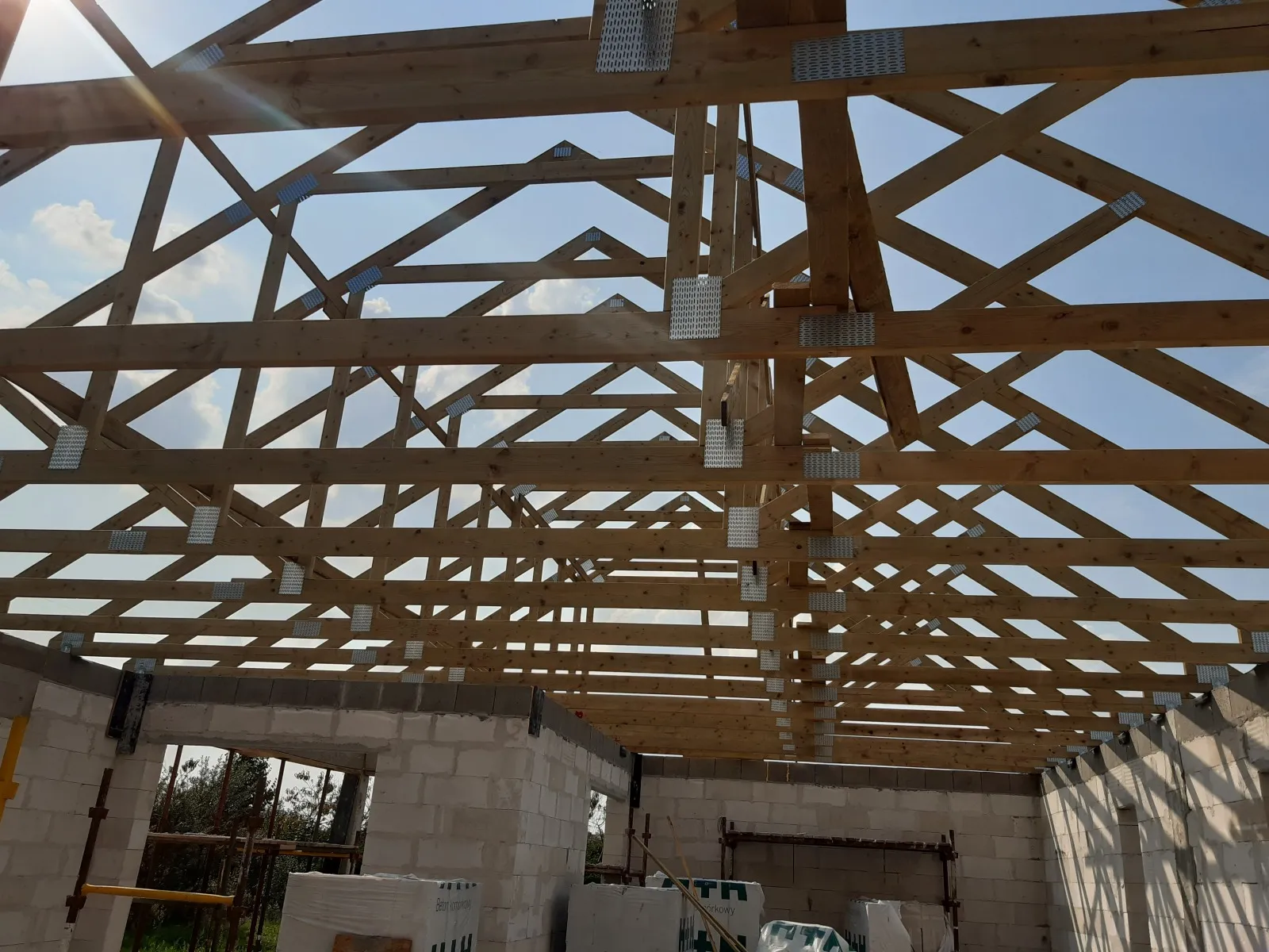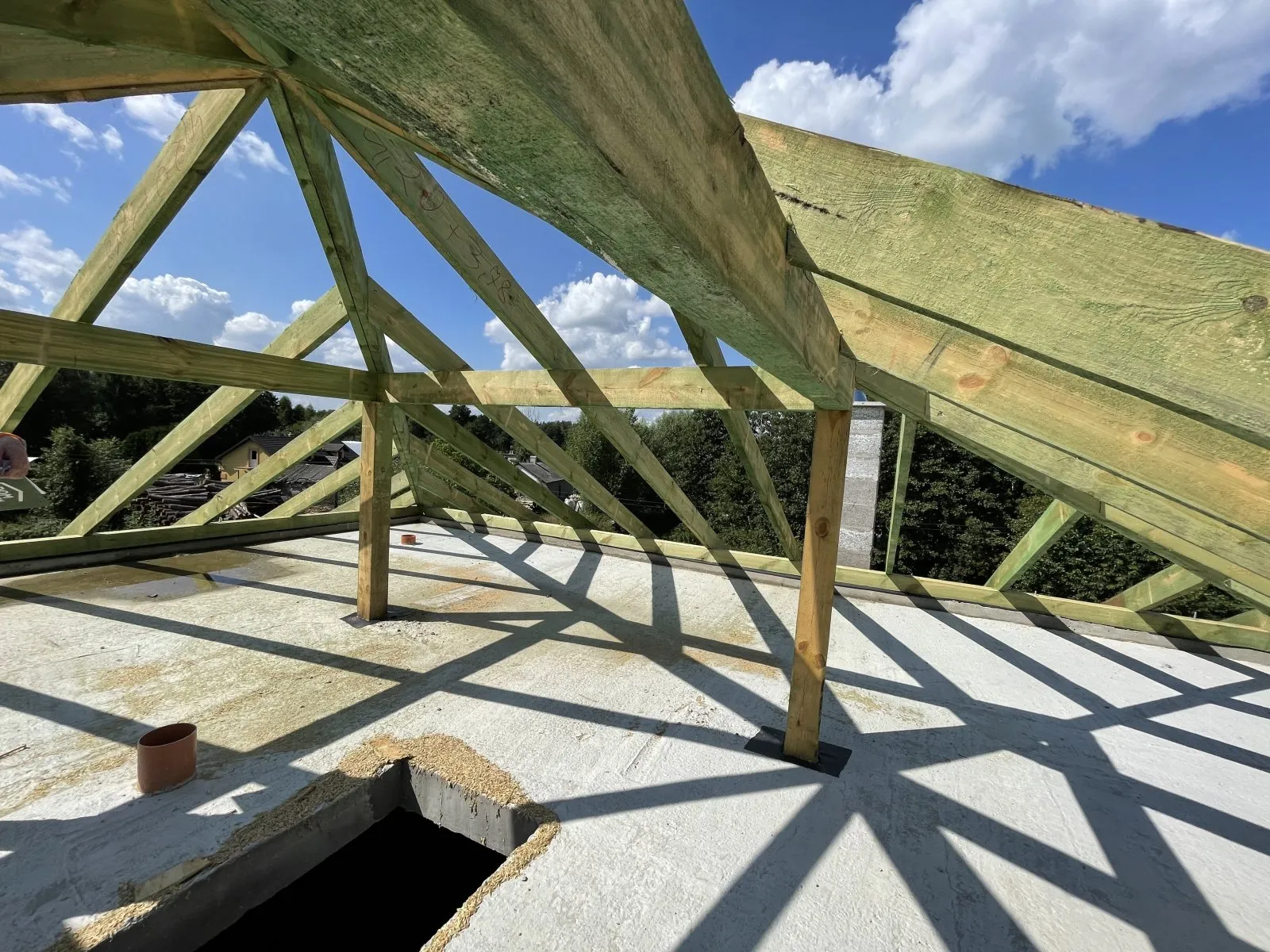 Drewno iglaste klasy C24, suszone, strugane, impregnowane lub tarcica tradycyjna – w zależności od wybranej opcji. Pokrycie dachu: paroizolacja, łaty, kontrłaty, dachówka betonowa falista, ... więcejblacha na rąbek lub blachodachówka – w zależności od wybranej opcji. Docieplenie dachu: wełna mineralna o parametrach zgodnych z WT2021 lub natrysk piany PUR o grubości minimum 25 cm – w zależności od wybranej opcji.