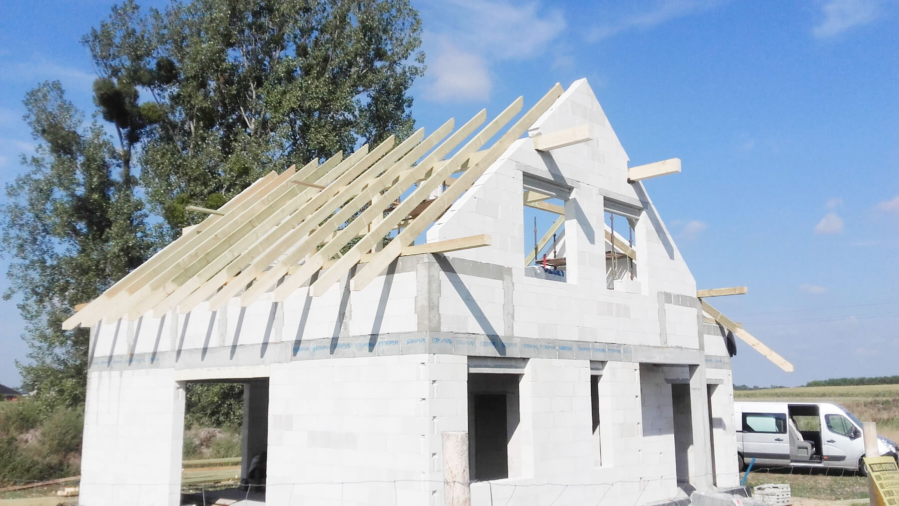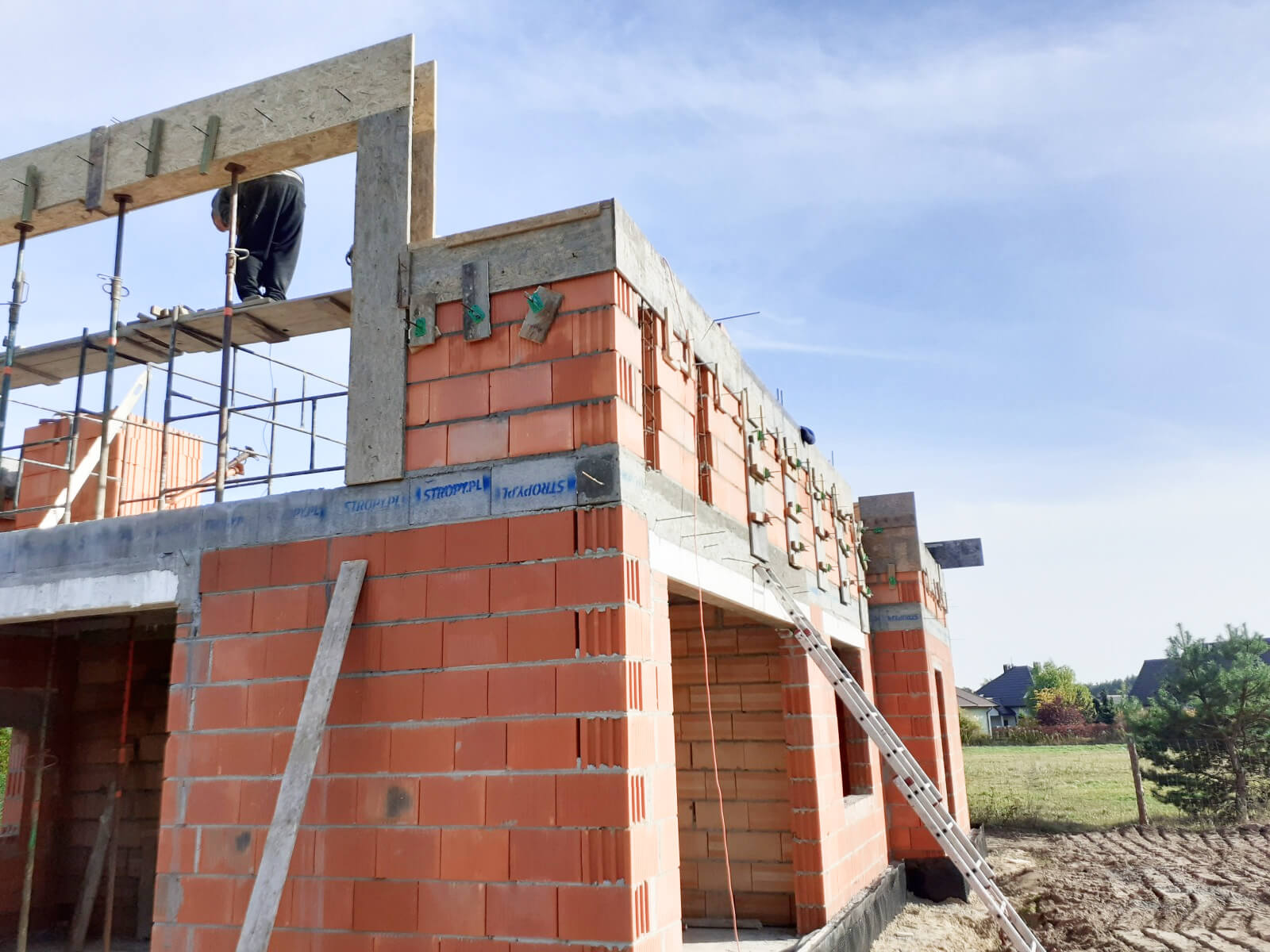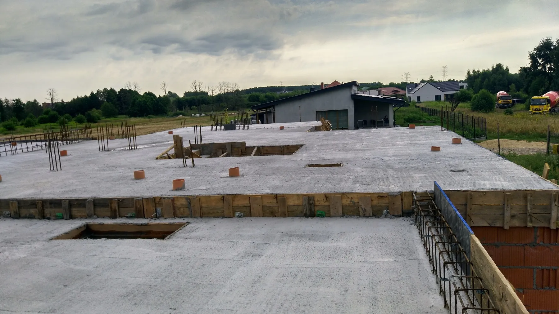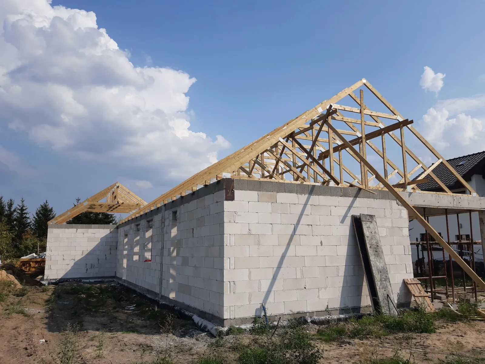 Po ułożeniu i zaizolowaniu fundamentów można przejść do kolejnego etapu, który obejmuje prace związane z murowaniem ścian i kominów. W tej części wykonywane są także stropy, schody żelbetowe oraz więźba dachowa. Zwieńczeniem prac jest budowa dachu i ułożenie jego pokrycia, a także montaż rynien.