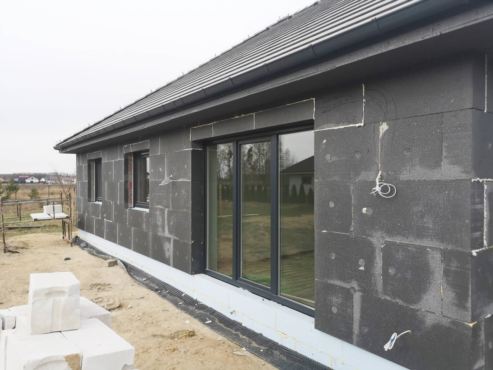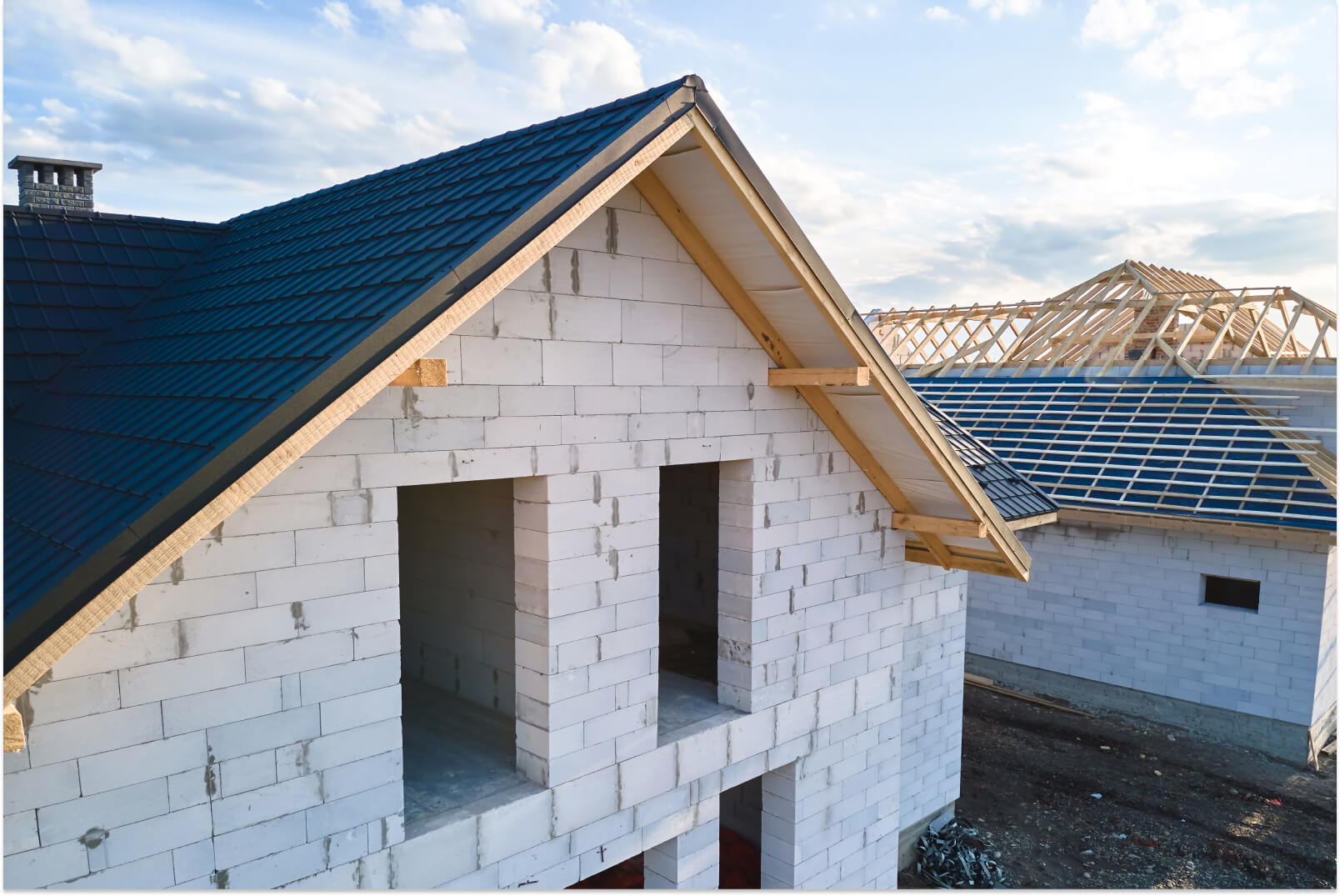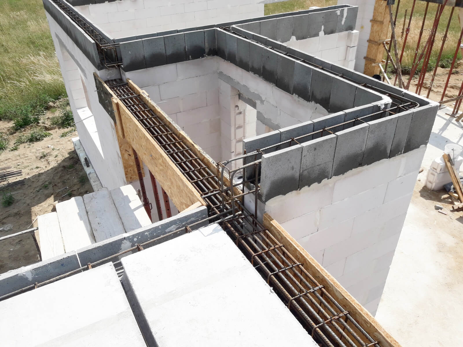 Po ułożeniu i zaizolowaniu fundamentów można przejść do kolejnego etapu, który obejmuje prace związane z murowaniem ścian i kominów. W tej części wykonywane są także stropy, schody żelbetowe oraz więźba dachowa. Zwieńczeniem prac jest budowa dachu i ułożenie jego pokrycia, a także montaż rynien.