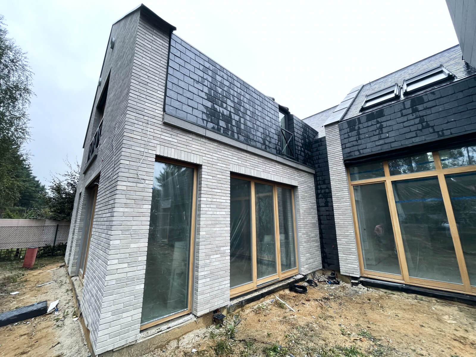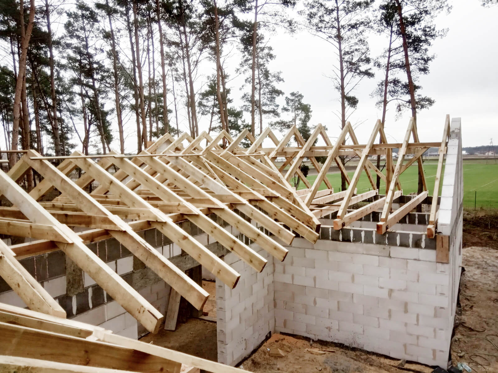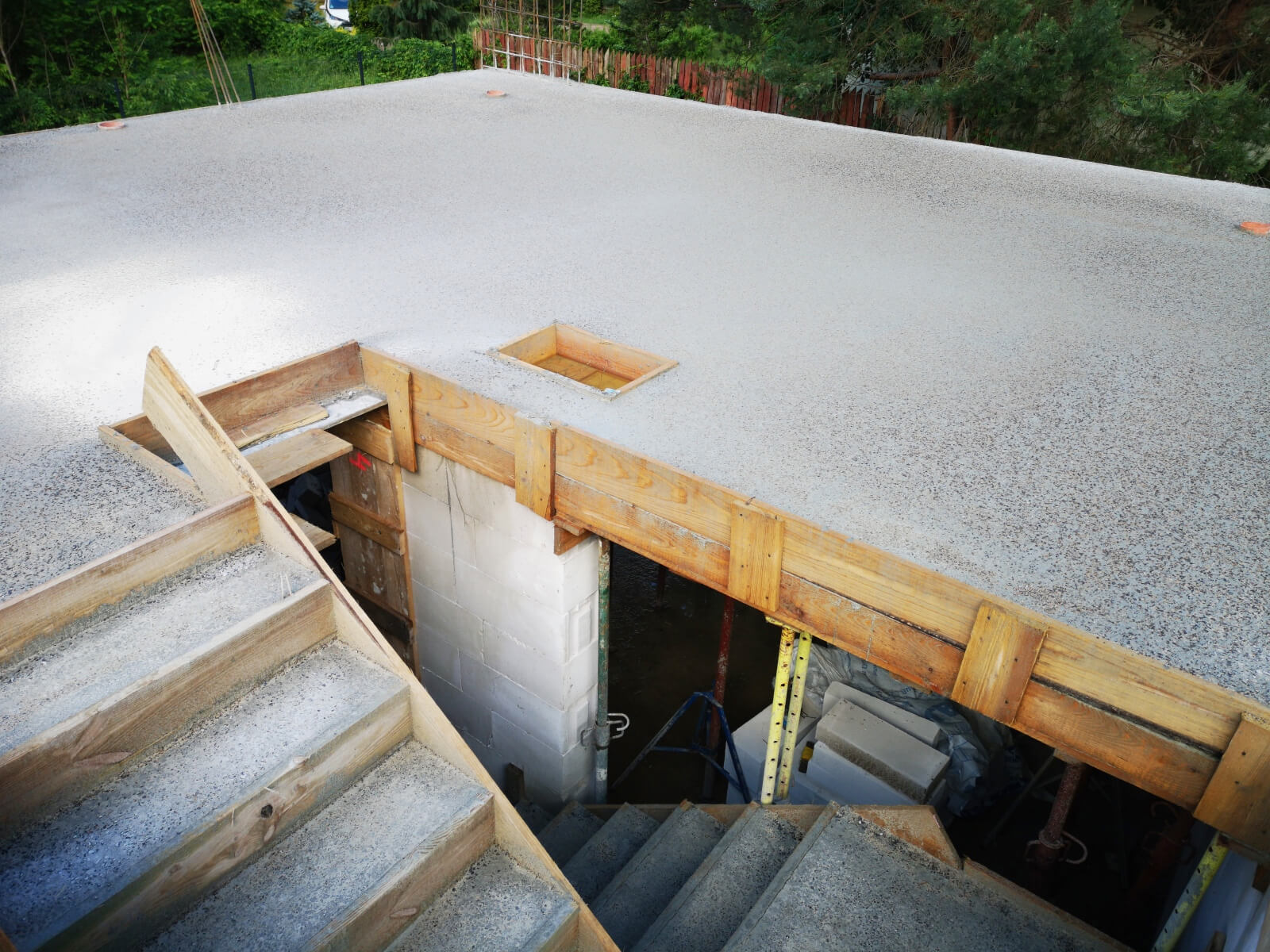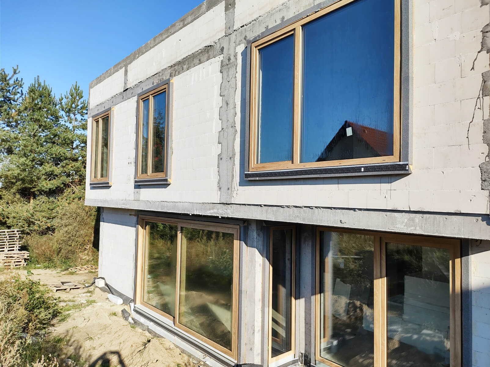 Po ułożeniu i zaizolowaniu fundamentów można przejść do kolejnego etapu, który obejmuje prace związane z murowaniem ścian i kominów. W tej części wykonywane są także stropy, schody żelbetowe oraz więźba dachowa. Zwieńczeniem prac jest budowa dachu i ułożenie jego pokrycia, a także montaż rynien.