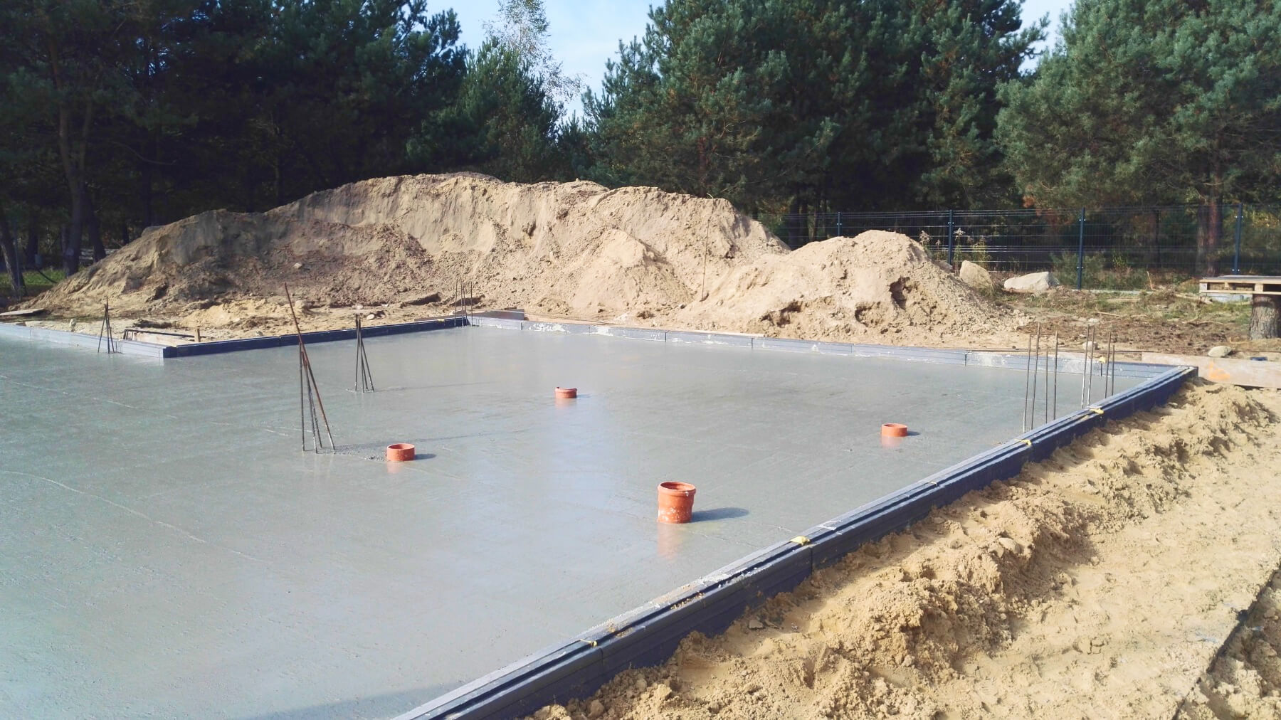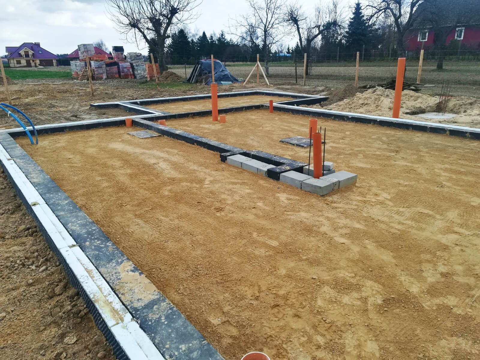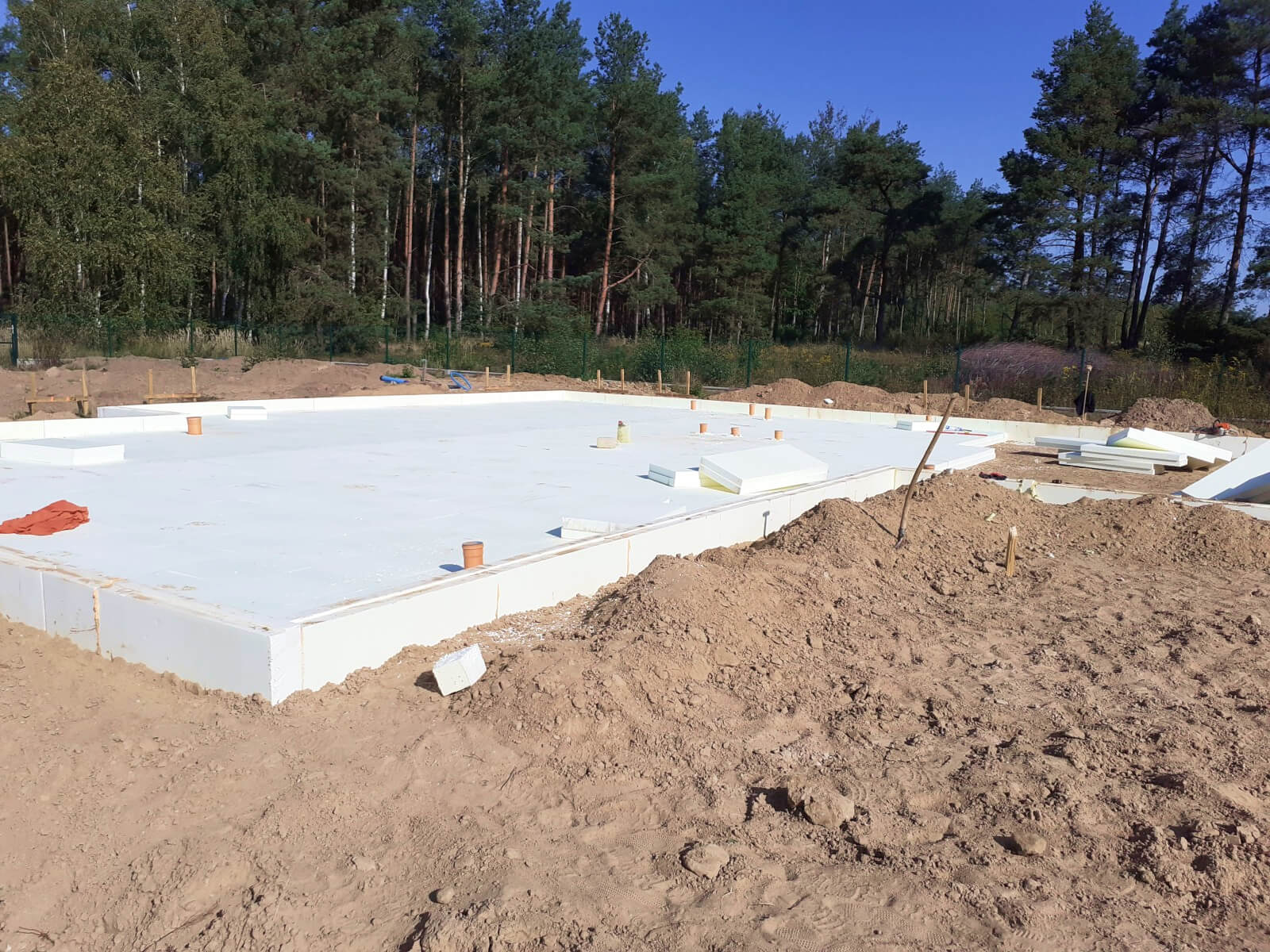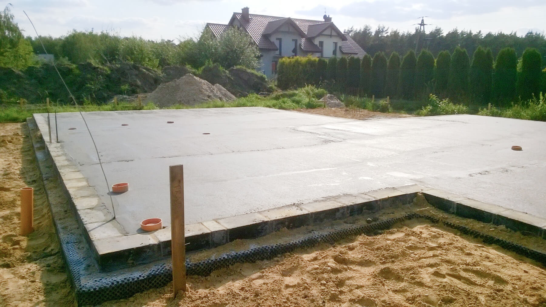 Płyta fundamentowa (lub ławy fundamentowe), instalacja kanalizacyjna, przepusty do przyłącza elektrycznego i wodnego, hydroizolacja, wylewka cementowa (pod warunkiem wybrania takiej opcji).
