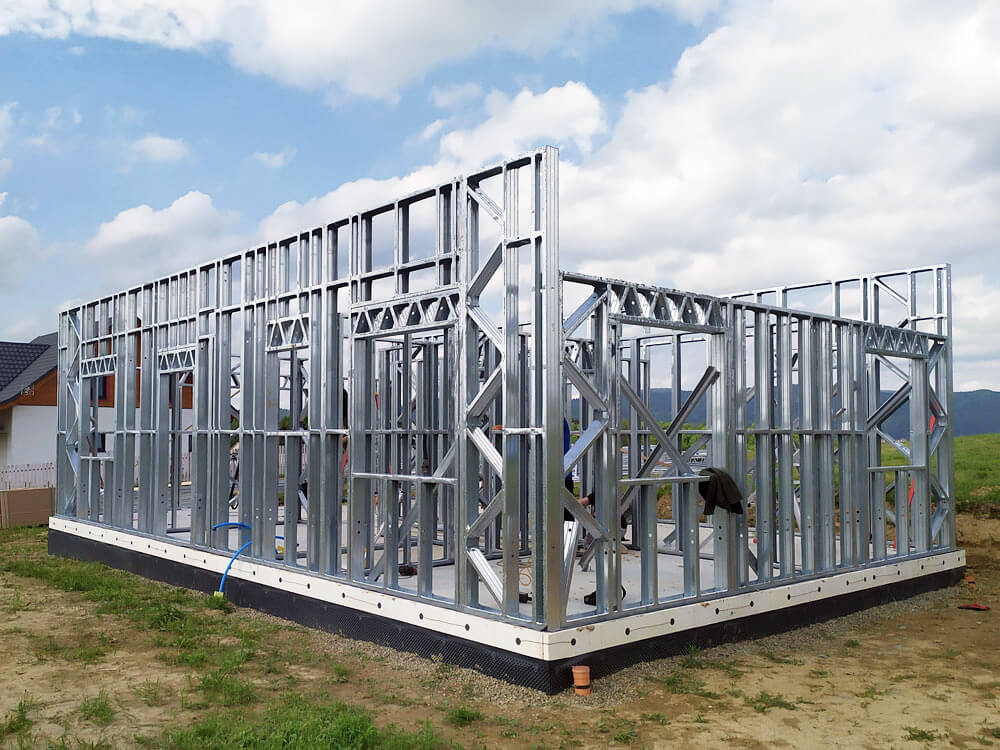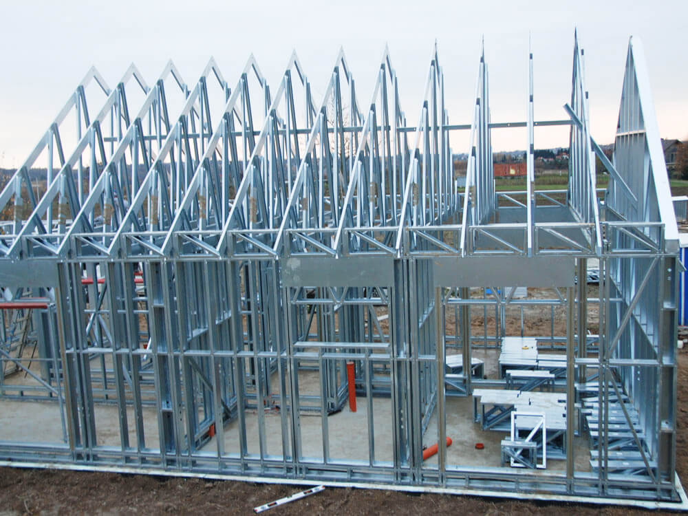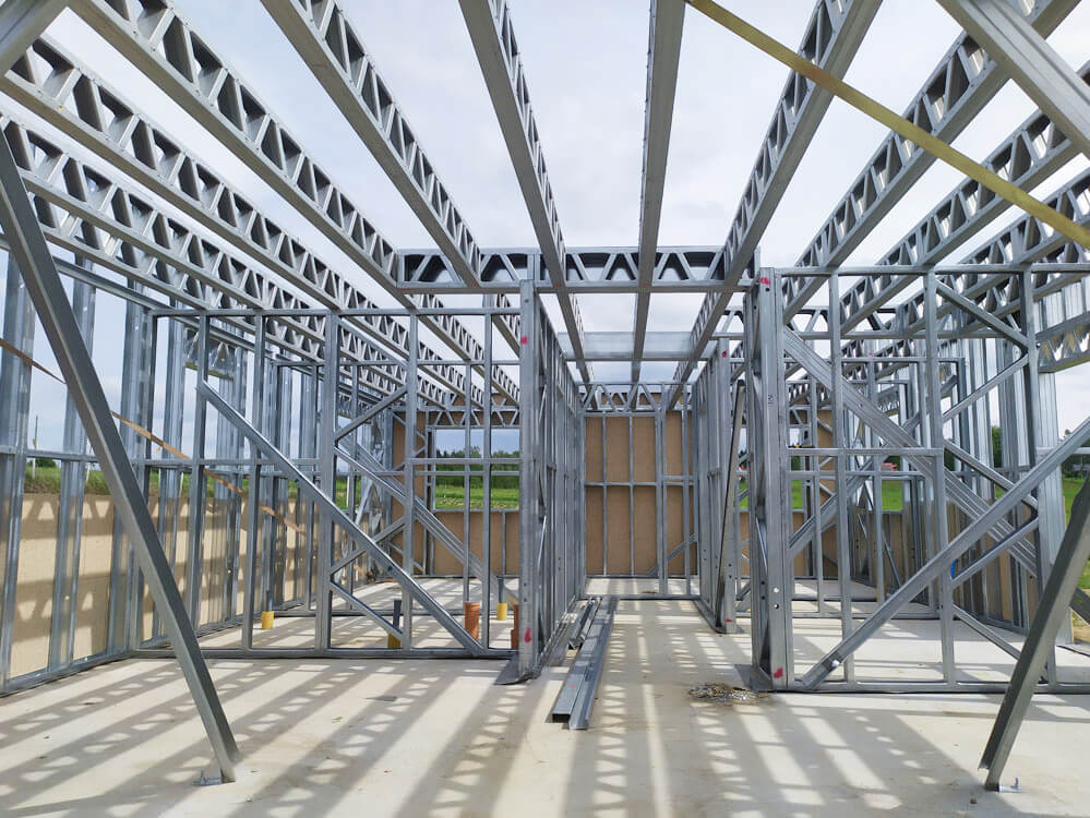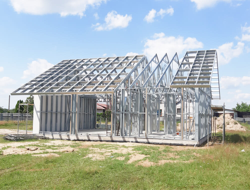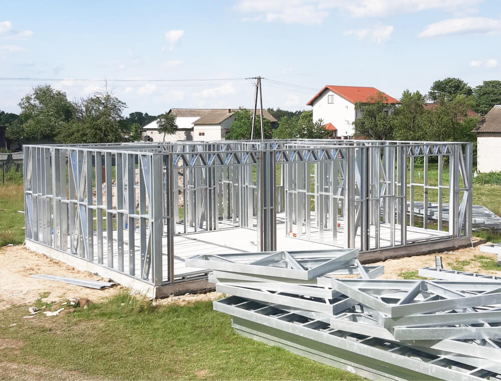 Budowa polega na postawieniu całej konstrukcji budynku (ściany, strop, konstrukcja dachu) z elementów stalowych, wykonanych w warunkach fabrycznych, na bazie szczegółowego projektu konstrukcyjnego.