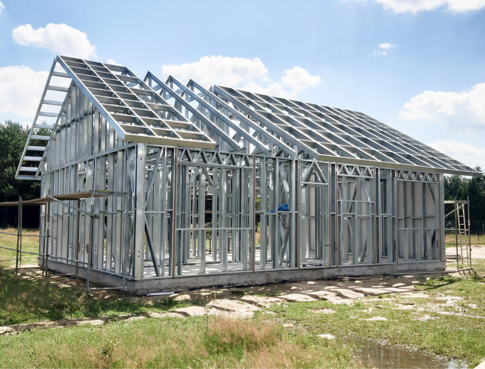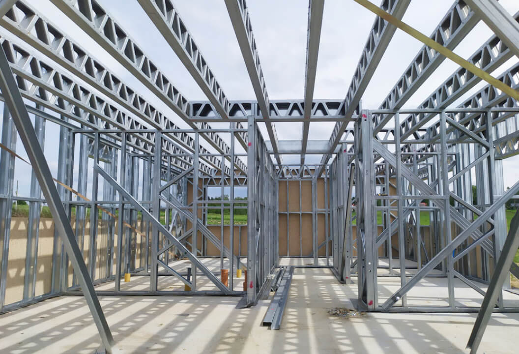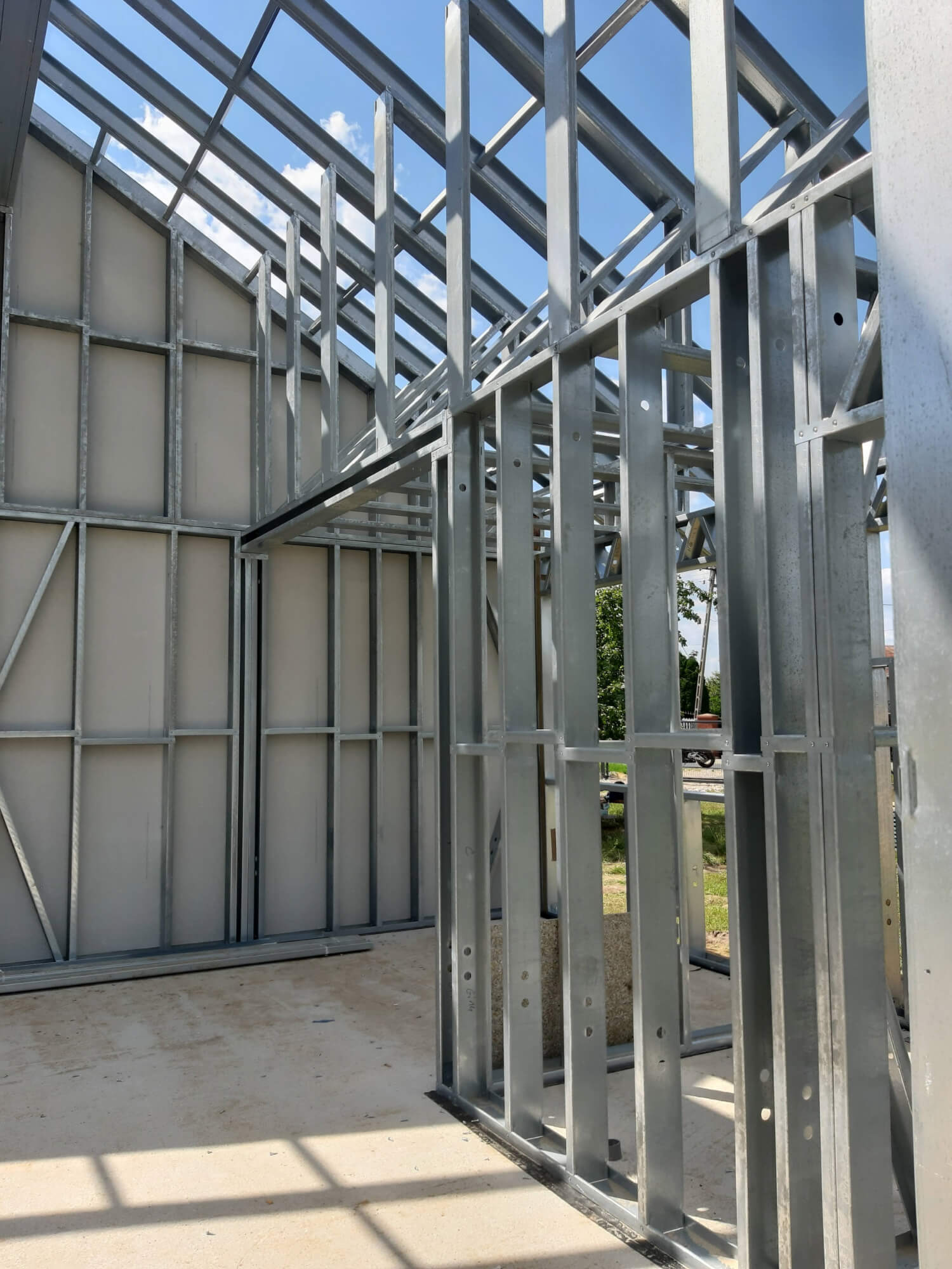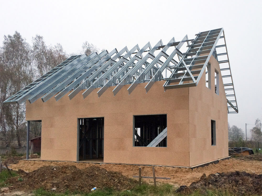 Budowa polega na postawieniu całej konstrukcji budynku (ściany, strop, konstrukcja dachu) z elementów stalowych, wykonanych w warunkach fabrycznych, na bazie szczegółowego projektu konstrukcyjnego.
