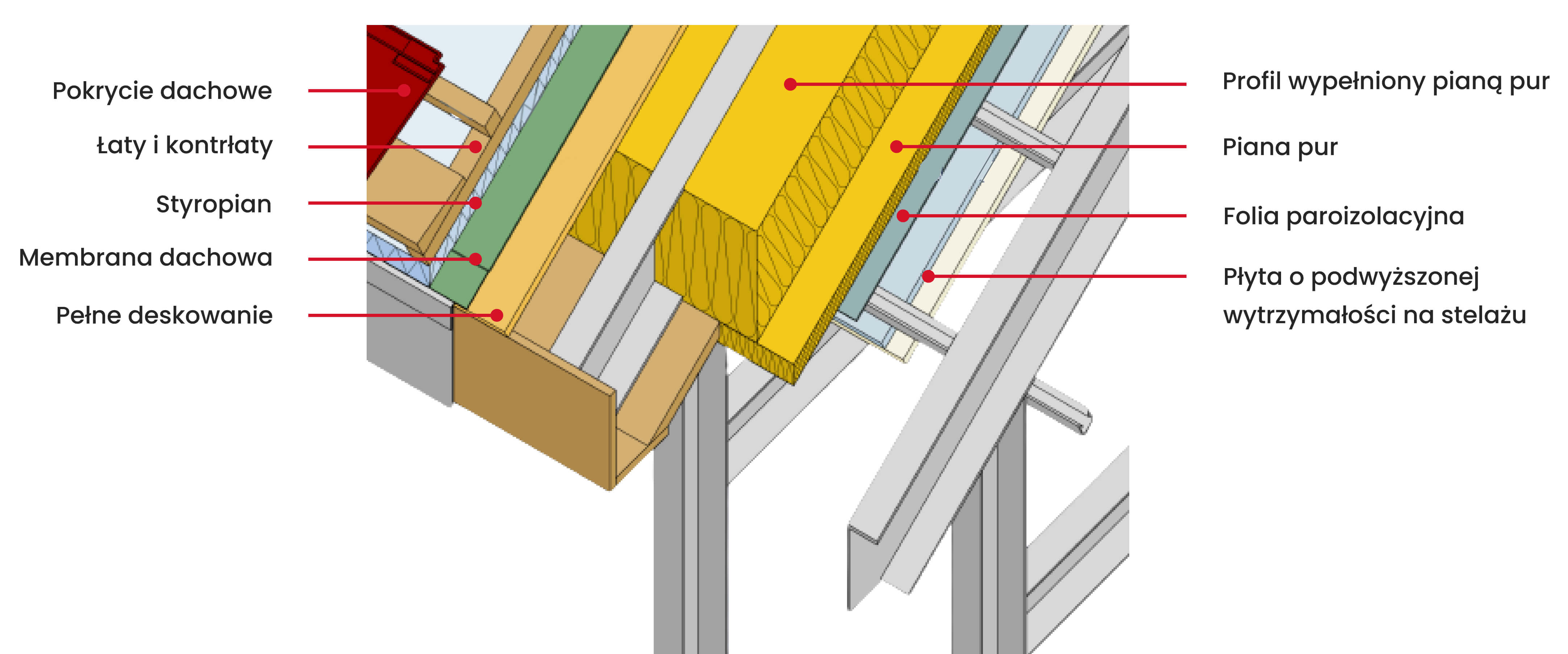 Jeżeli chodzi o dach, jego konstrukcja tworzona jest ze stalowego szkieletu, zaś pokrycie wykonywane jest standardowo na łatach i kontrłatach. Inwestor może zdecydować się na dowolne pokrycie dachowe - blachodachówkę, blachę na rąbek stojący lub dachówki ceramiczne czy cementowe.