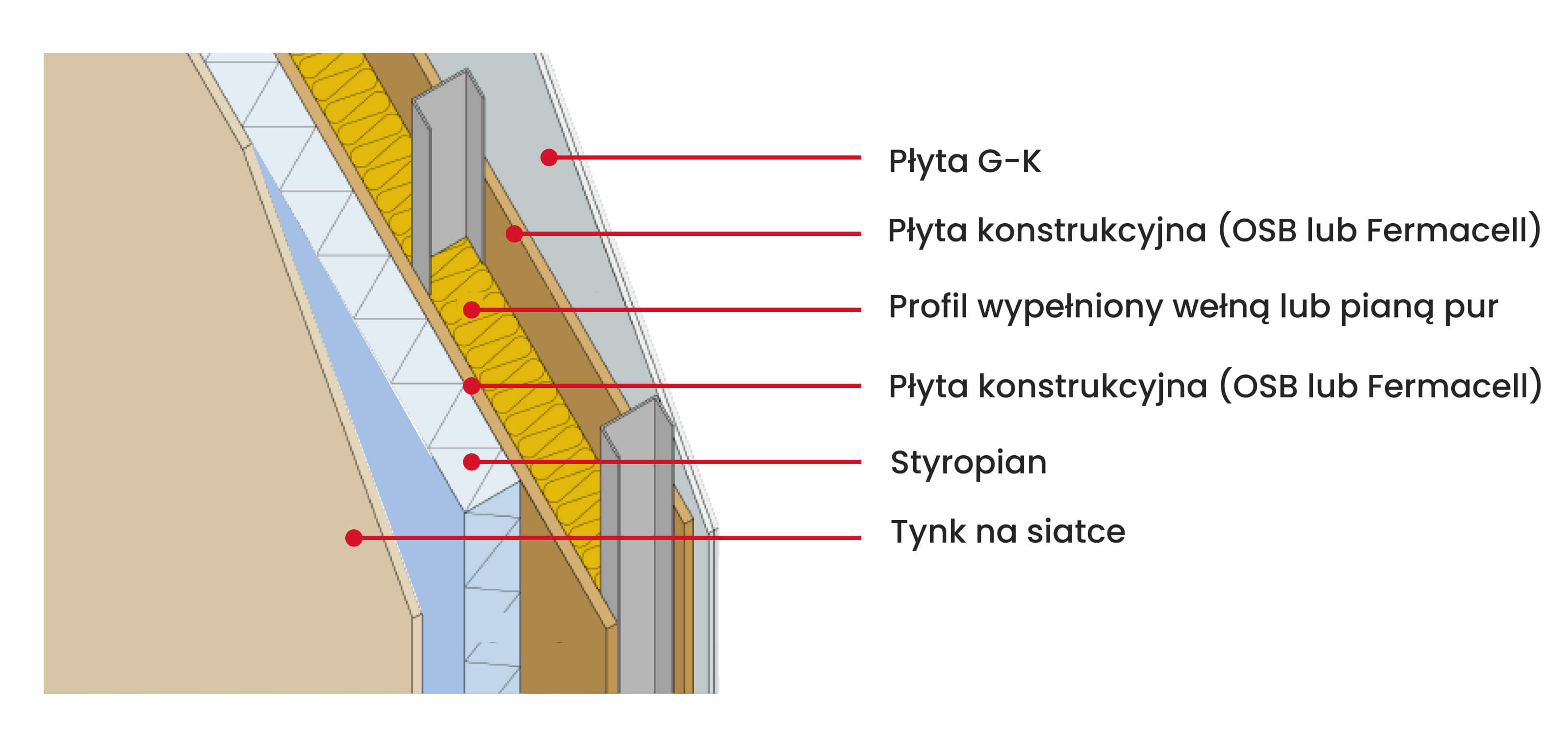 Ściany zewnętrzne - szkielet stalowy, wełna lub pianka poliuretanowa, płyta OSB lub płyta Fermacell, izolacja, tynk. Ściany wewnętrzne - szkielet stalowy, wełna lub pianka poliuretanowa, płyta OSB, płyta G-K lub płyta Fermacell.