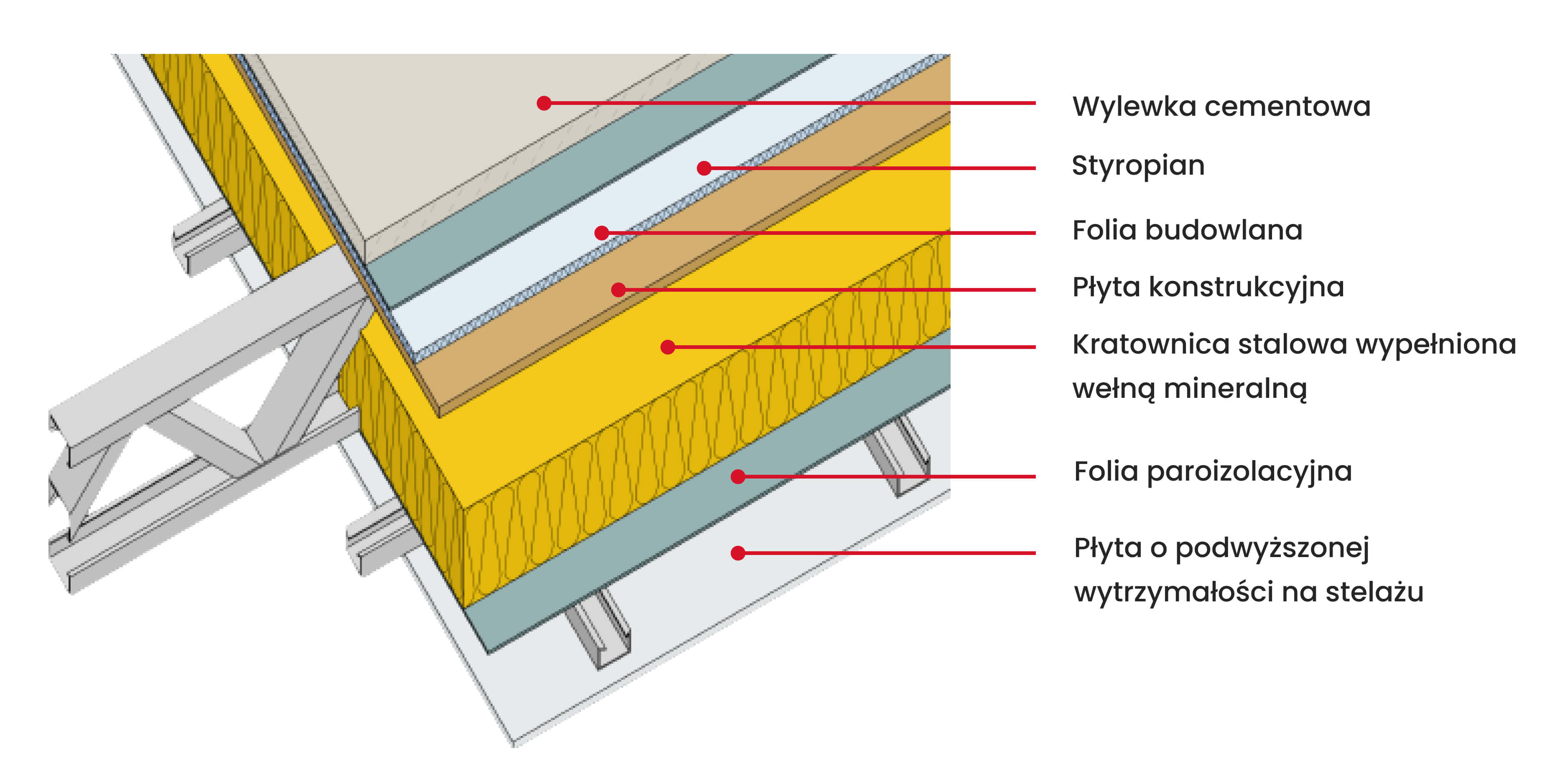 Podstawą stropu w domach piętrowych jest kratownica stalowa wypełniona wełną mineralną. Od strony parteru wykończenie to płyty G-K na stelażu, na piętrze znajduje się wylewka lekka cementowa.