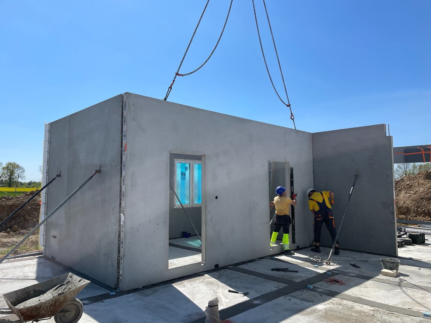 Domy z gotowych elementów betonowych powstają w oparciu o precyzyjnie wymierzone i dopasowane co do milimetra prefabrykaty, dzięki czemu prace przebiegają sprawnie i terminowo. Sam montaż, w zależności od wielkości domu, może zająć nawet tydzień, a zakończenie wszystkich prac może mieć miejsce po zaledwie 3 miesiącach.