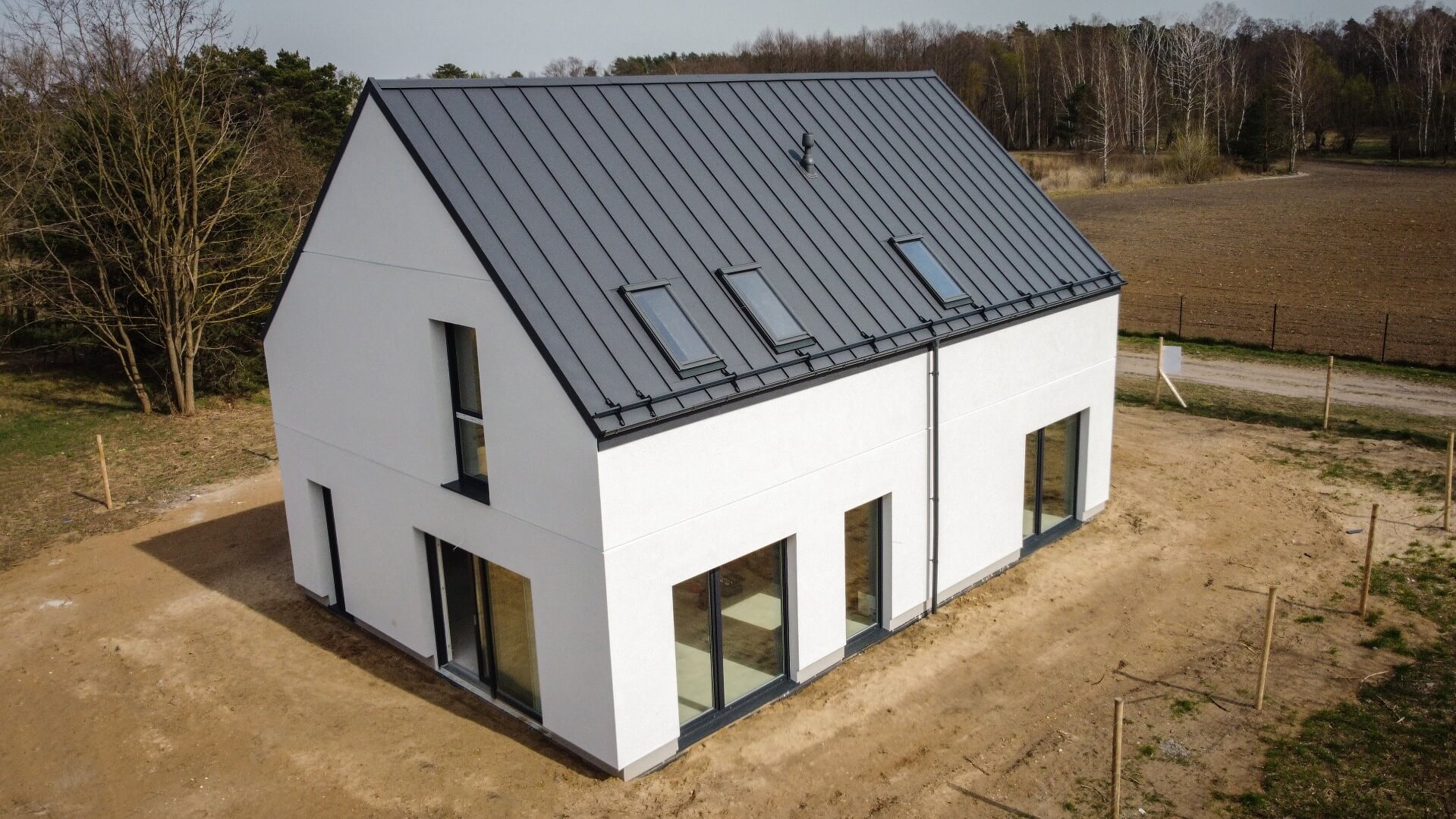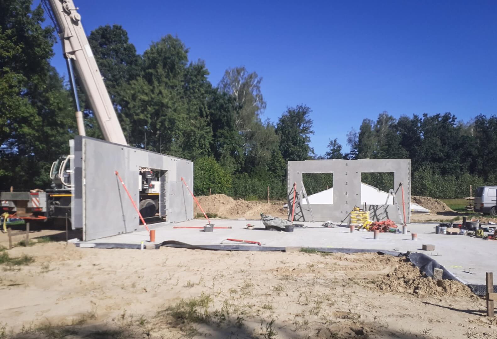 Montaż ścian konstrukcyjnych na gotowych fundamentach to kwestia kilku dni. Większość precyzyjnych prac wykonuje się w fabryce, dzięki czemu na budowie panuje zdecydowanie większy porządek. Średni czas potrzebny na wykonanie domu do standardu deweloperskiego (już z instalacjami), to 1-3 miesiące. Termin warunkuje m.in. lokalizacja działki czy wybrany przez inwestora wariant.
