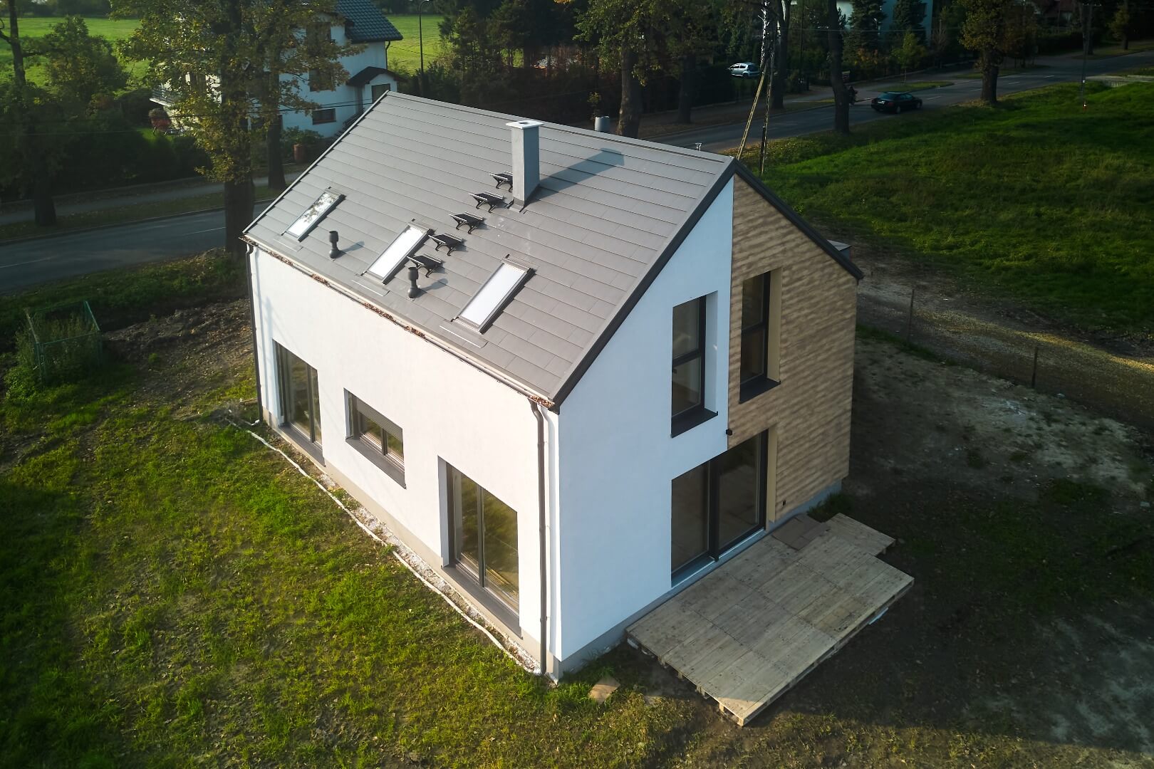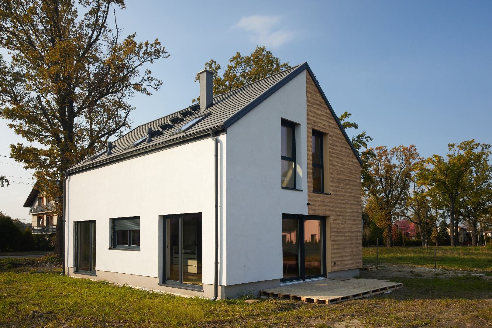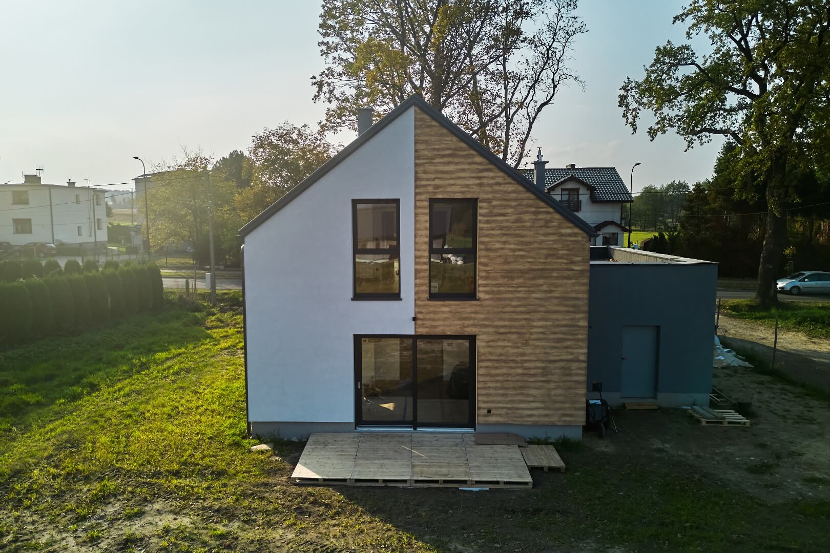 Dom może stanąć na przygotowanej działce już w miesiąc, niezależnie od pogody i pory roku. Plac budowy pozostaje czysty, ponieważ budowa nie generuje odpadów.