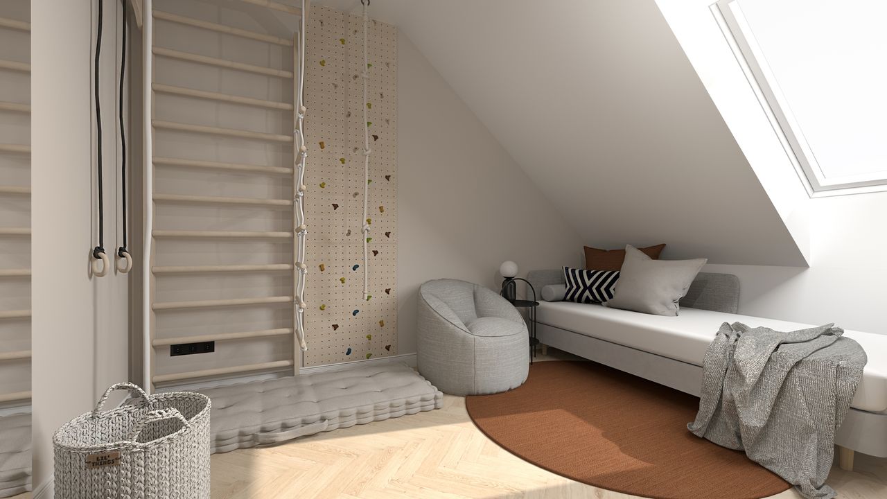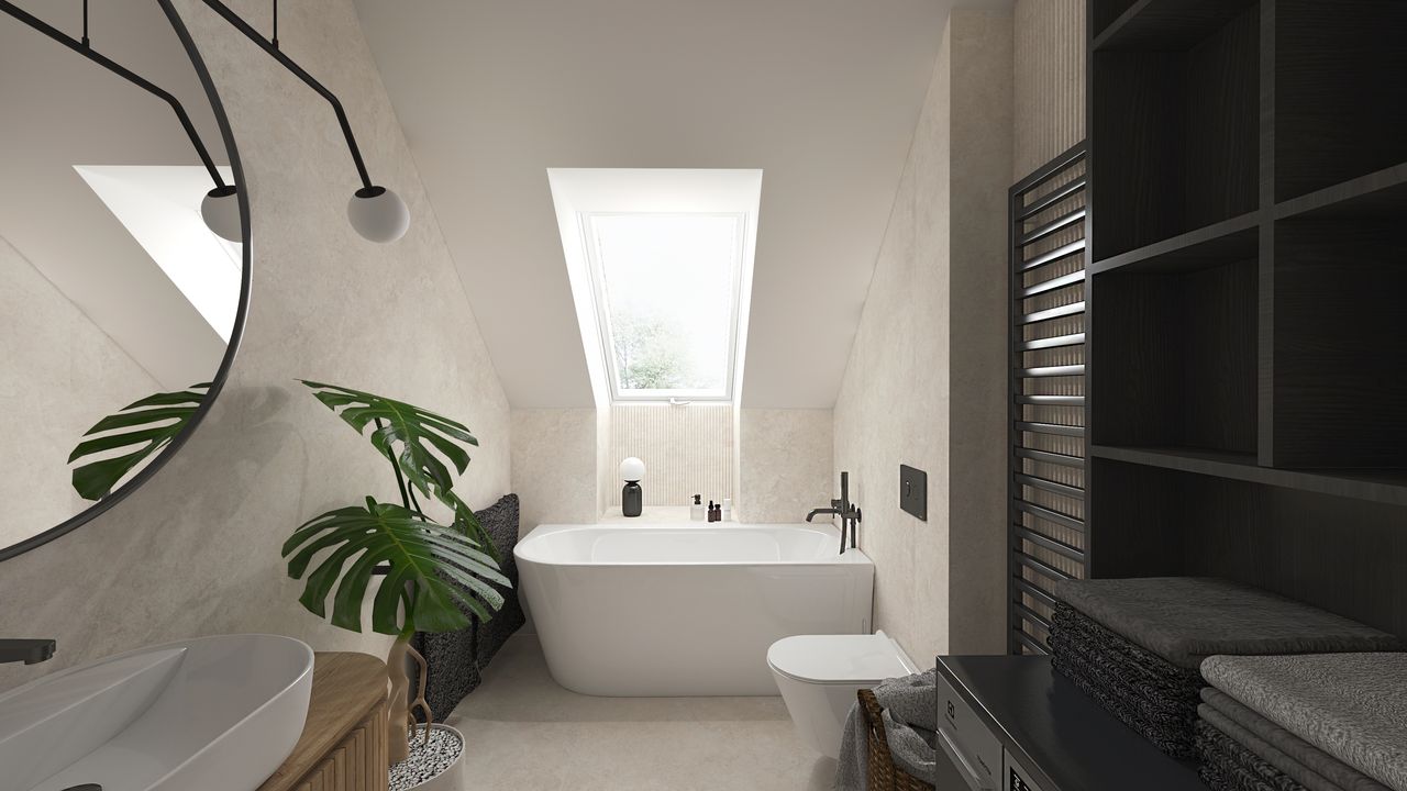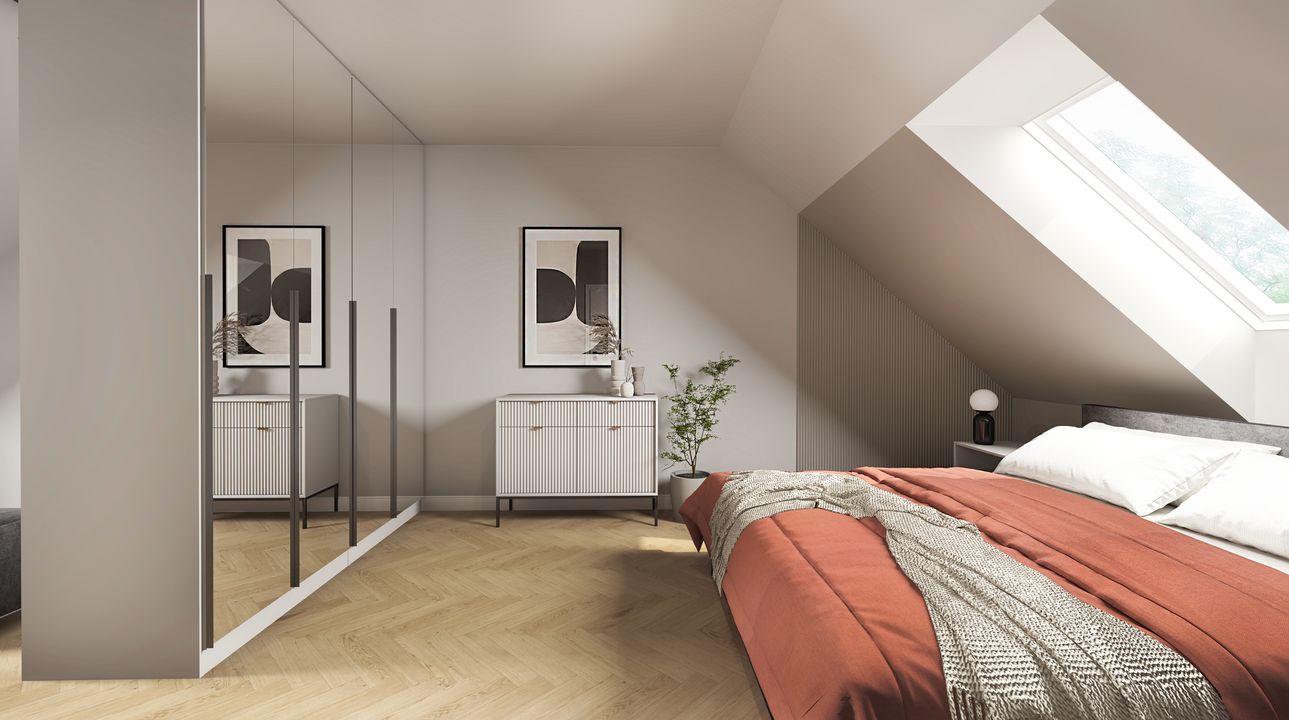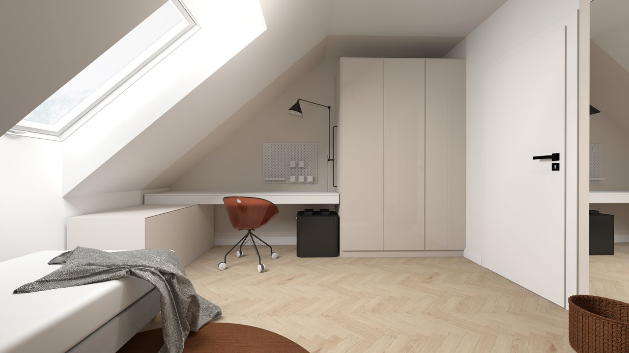Na parterze znajdziemy 2 pokoje, sypialnię i nieduży gabinet oraz łazienkę. Na poddaszu zaś mamy dużą i małą sypialnię oraz dodatkową łazienkę. Każde pomieszczenie doświetlają okna dachowe, wpuszczając dużo naturalnego światła do wnętrza.