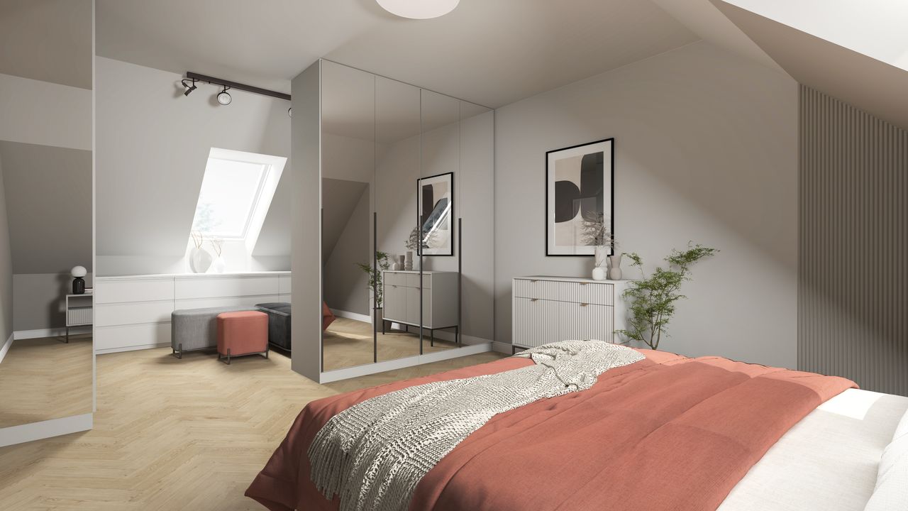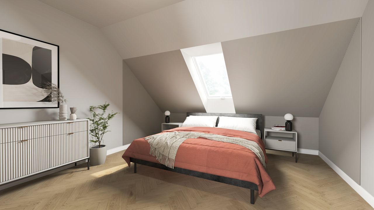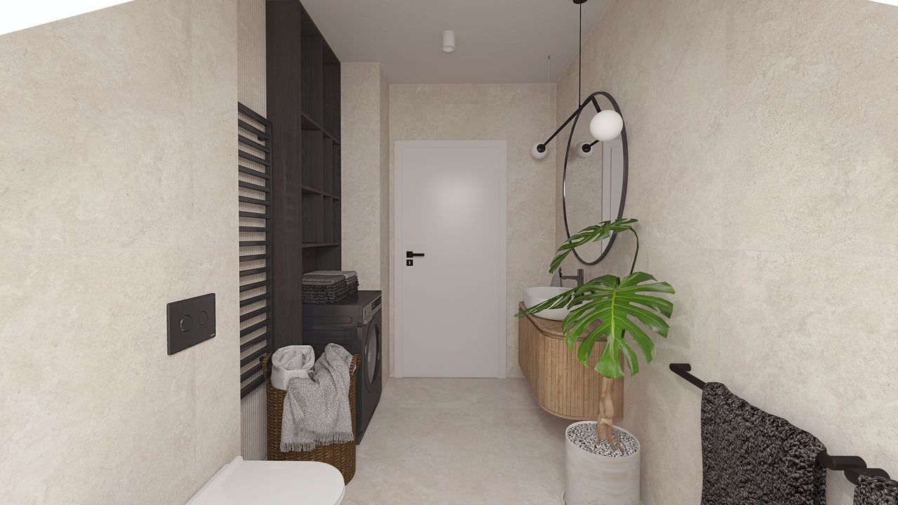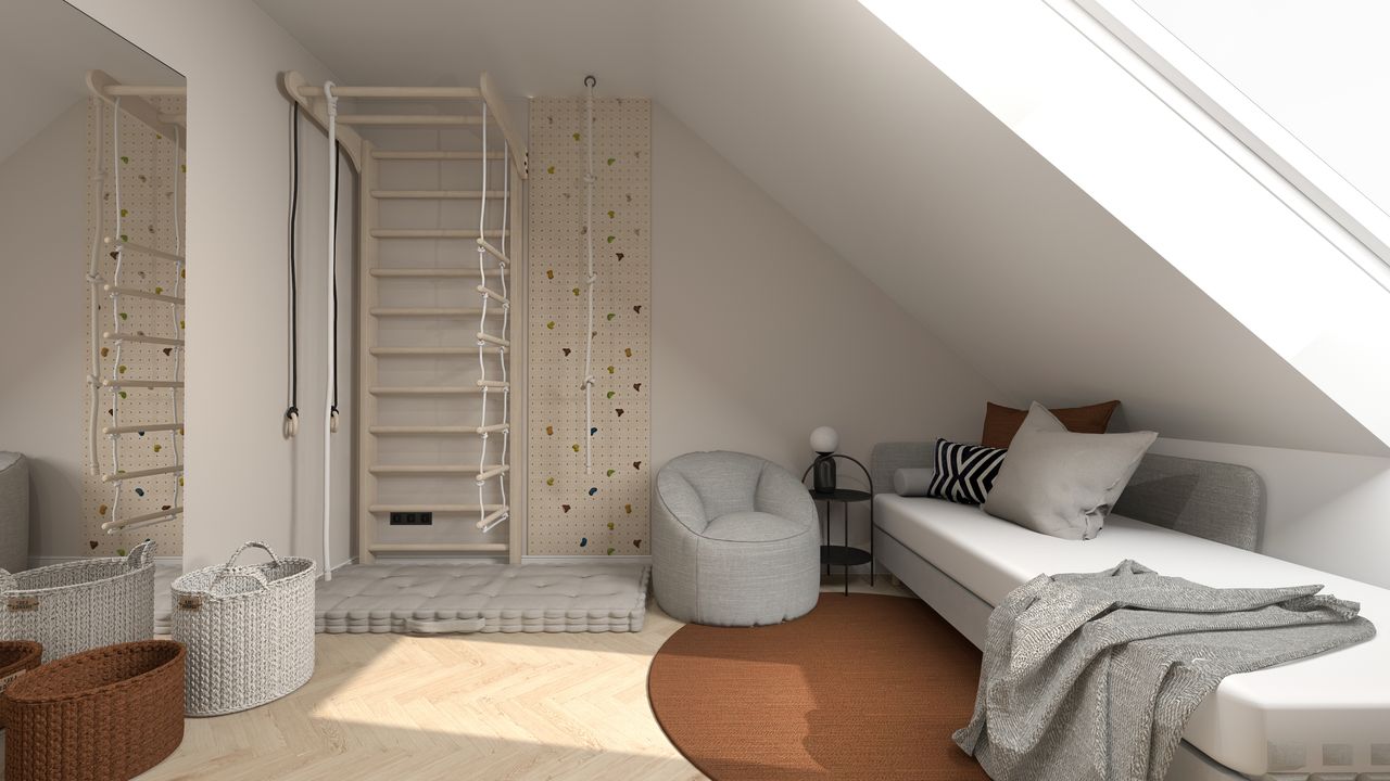 Na parterze znajdziemy 2 pokoje, sypialnię i nieduży gabinet oraz łazienkę. Na poddaszu zaś mamy dużą i małą sypialnię oraz dodatkową łazienkę. Każde pomieszczenie doświetlają okna dachowe, wpuszczając dużo naturalnego światła do wnętrza.