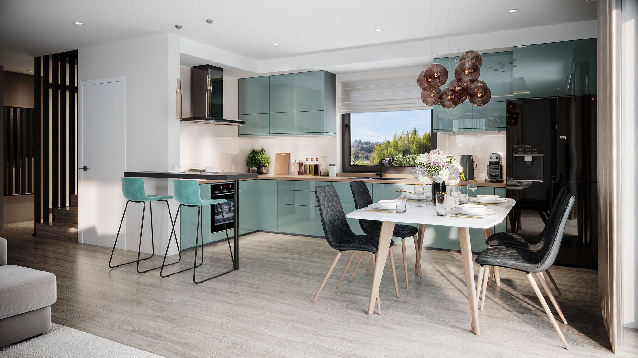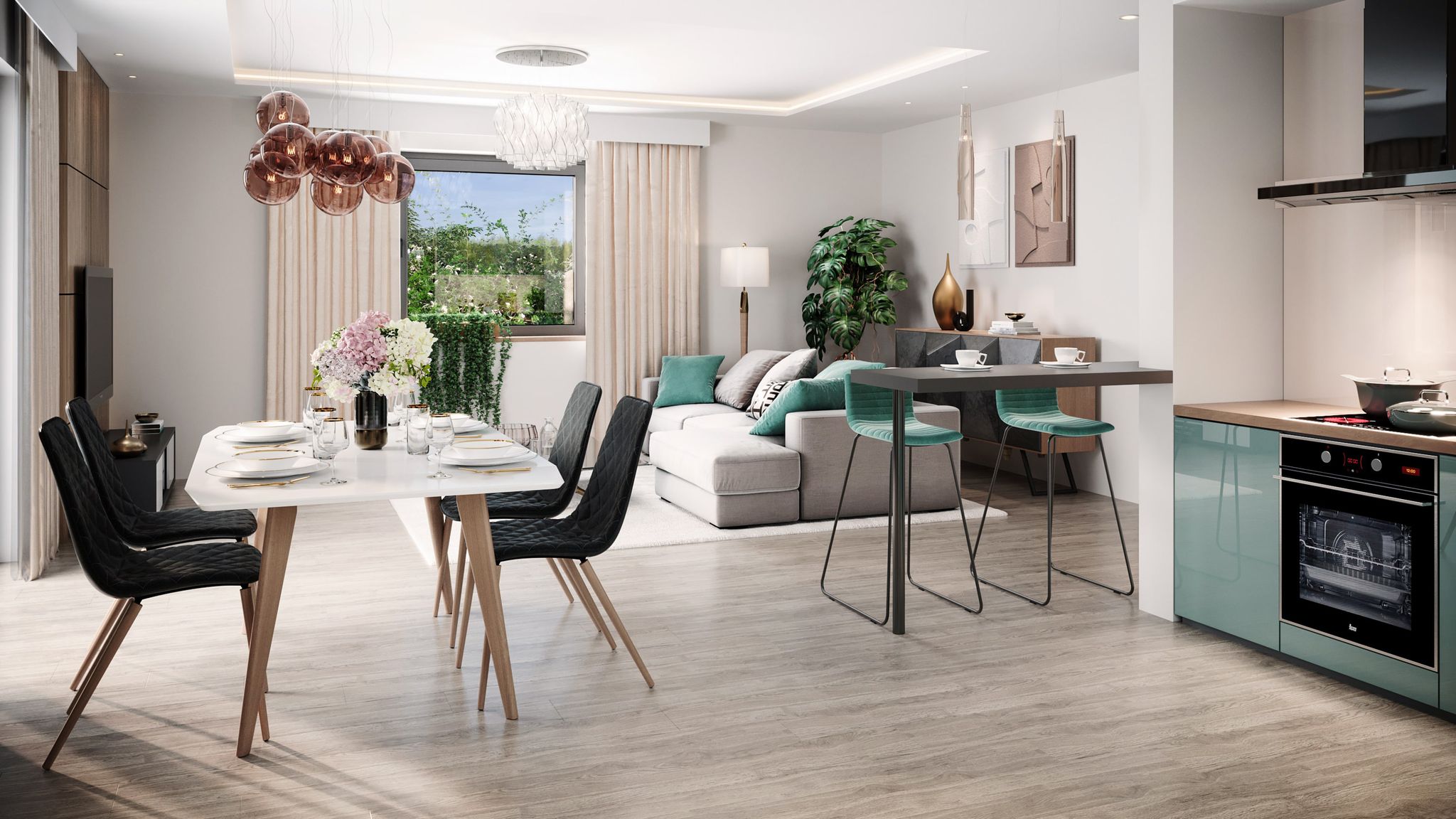 Na parterze pierwsze skrzypce gra otwarta przestrzeń. Mamy tu obszerny salon ze sporym aneksem kuchennym i szerokie drzwi balkonowe prowadzące na ogród. Znajdzie się tu wystarczająco dużo miejsca do zabawy i wspólnego spędzania czasu. W strefie dziennej bez problemu ustawimy komplet wypoczynkowy oraz stół z krzesłami.
