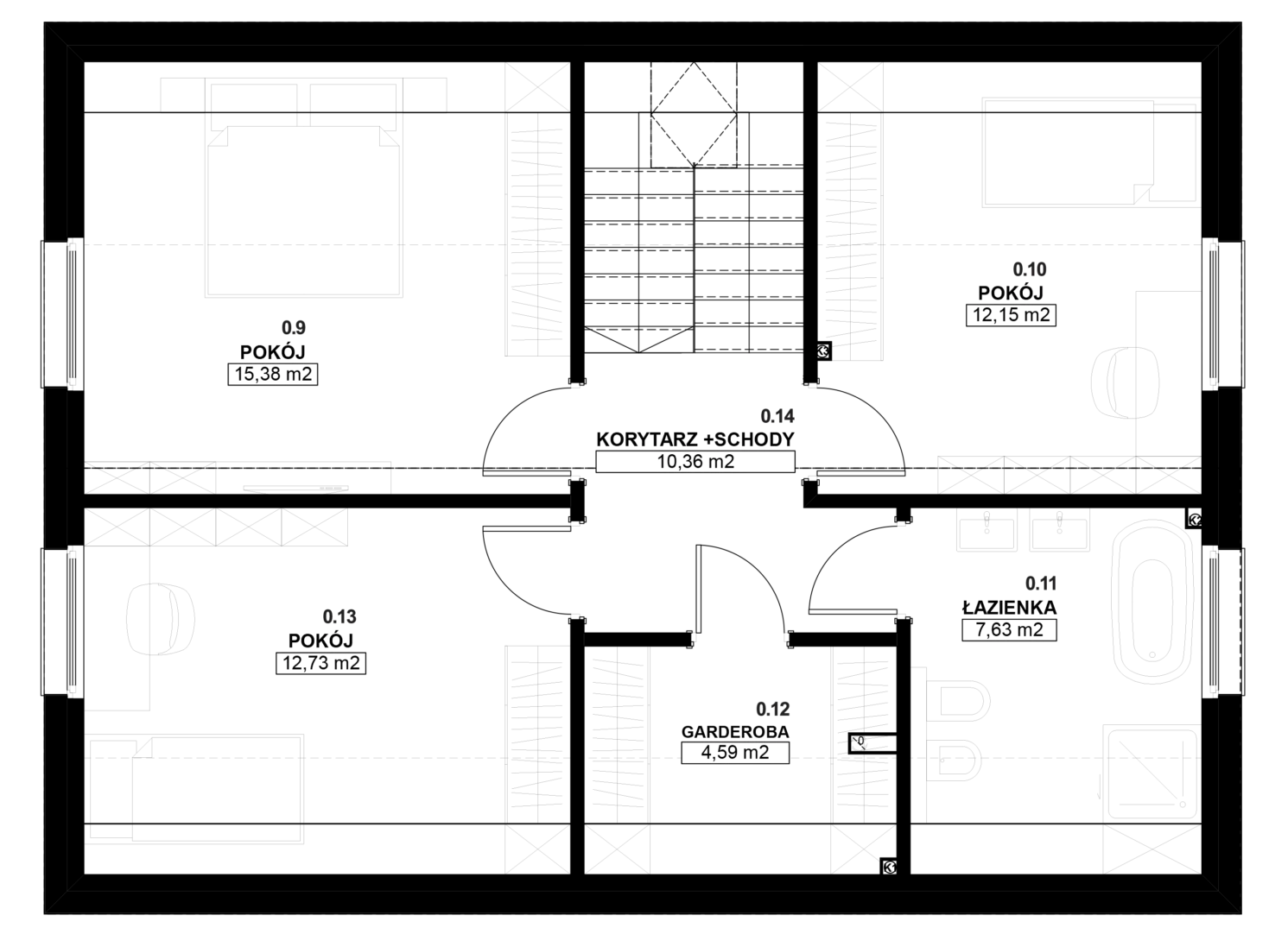 Poddasze zostało przeznaczone na 3 spore sypialnie, dużą wspólną garderobę i łazienkę. Taki rozdział funkcji zapewnia mieszkańcom sporo prywatności.