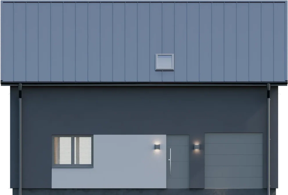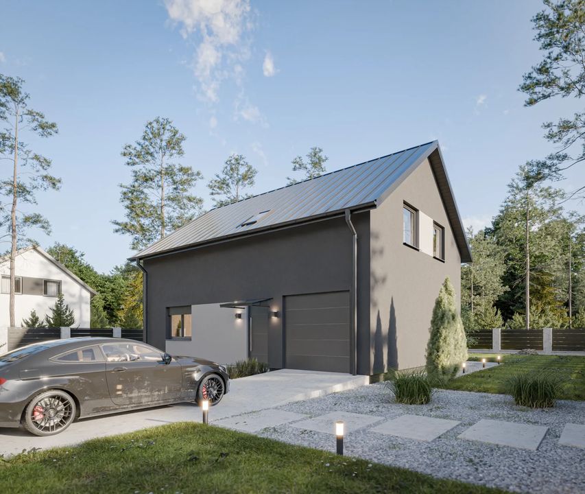 Dom Stodoła 150B wyróżnia się ciemną, elegancką elewacją z minimalistycznymi detalami oraz obecnością garażu w bryle budynku.