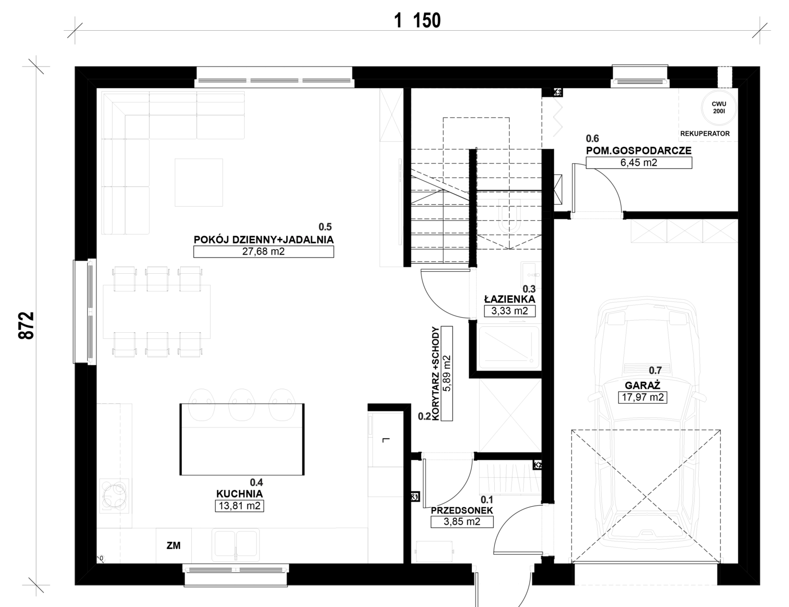 Domy z serii Stodoła 150 różnią się układami wnętrz, ale projektanci zadbali o dodatkowe pomieszczenia, które usprawniają codzienne funkcjonowanie. Sprawdź również: Stodoła 150A i Stodoła 150C.
