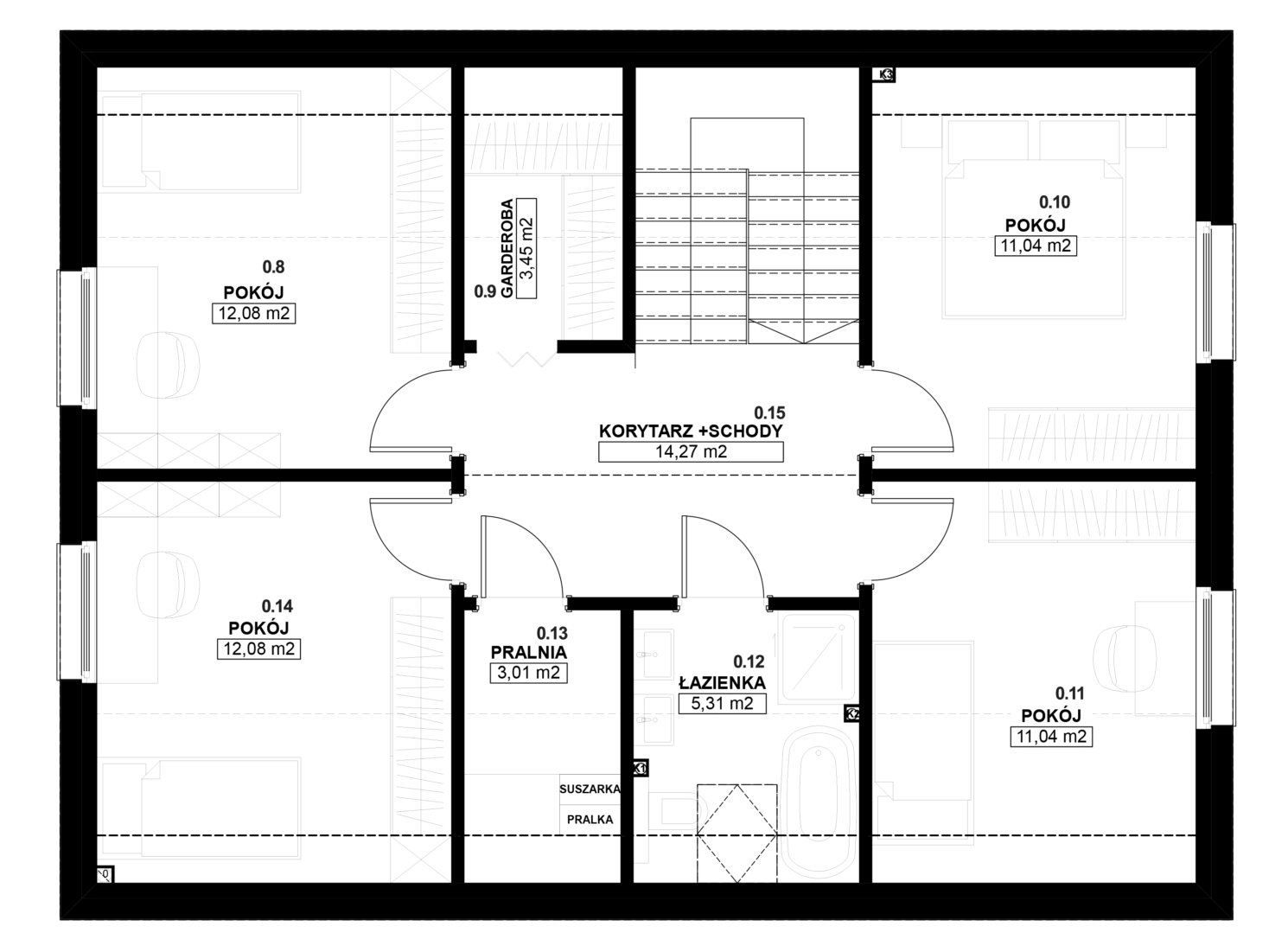Schodami udamy się na wysokie poddasze, gdzie znajdziemy 4 ustawne pokoje do dowolnej aranżacji, garderobę, większą łazienkę i pralnię. Taki układ pomieszczeń sprawia, że każdy z domowników może czuć się komfortowo.
