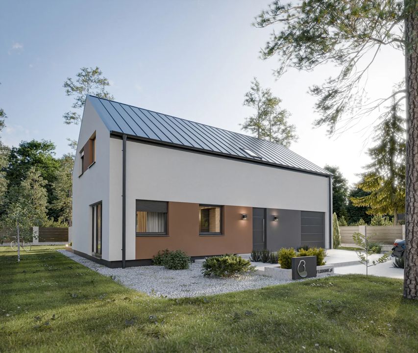 Dach dwuspadowy pokryty blachodachówką.