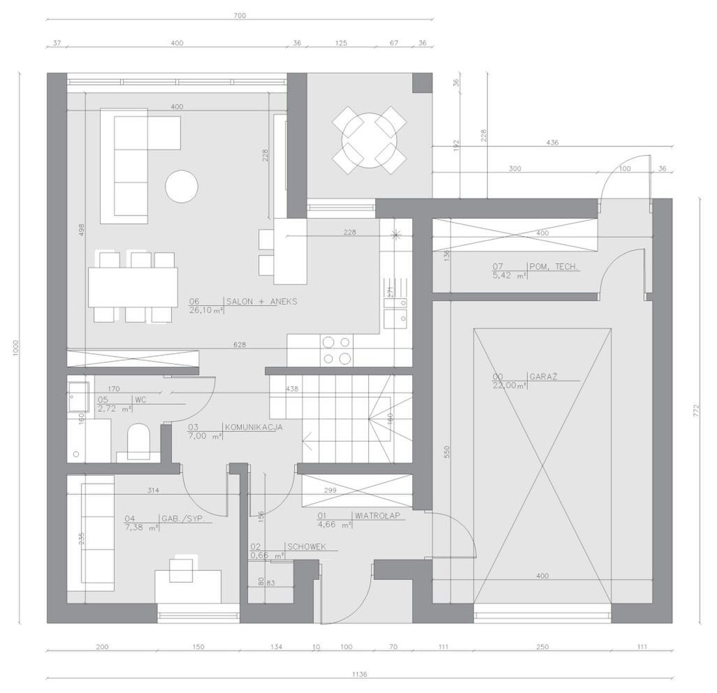 Graficzne opracowanie rzutów poglądowych widocznych na karcie projektu zostało wykonane przez Extradom.pl. Prezentowane przez Extradom.pl wizualizacje wykonane zostały przez autora projektu i należy poczytywać je jedynie za przykład i propozycję wykończenia, wizję architektoniczną autora projektu. Ostateczne wykończenie budynku może nastąpić na wiele sposobów. Szczegółowe rozwiązania zastosowane w oferowanej dokumentacji - w tym również ilość, lokalizacje i wygląd okien, drzwi, kominów - mogą w niewielkim stopniu różnić się od prezentowanej wizualizacji budynku.