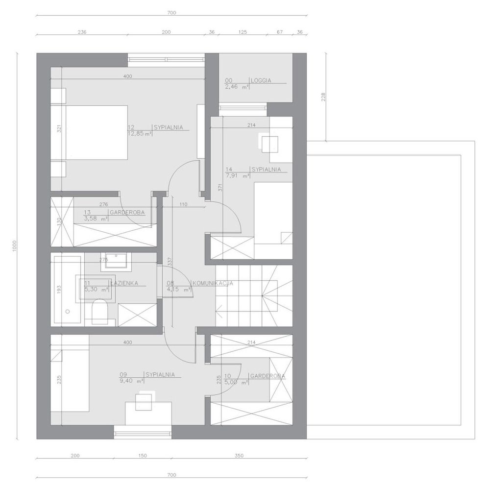 Na poddaszu, w strefie nocnej zaprojektowano 3 sypialnie - 2 większe z garderobami i jedną mniejszą z dostępem do loggi, oraz łazienkę. Pokoje doświetlają duże trójkątne okna.