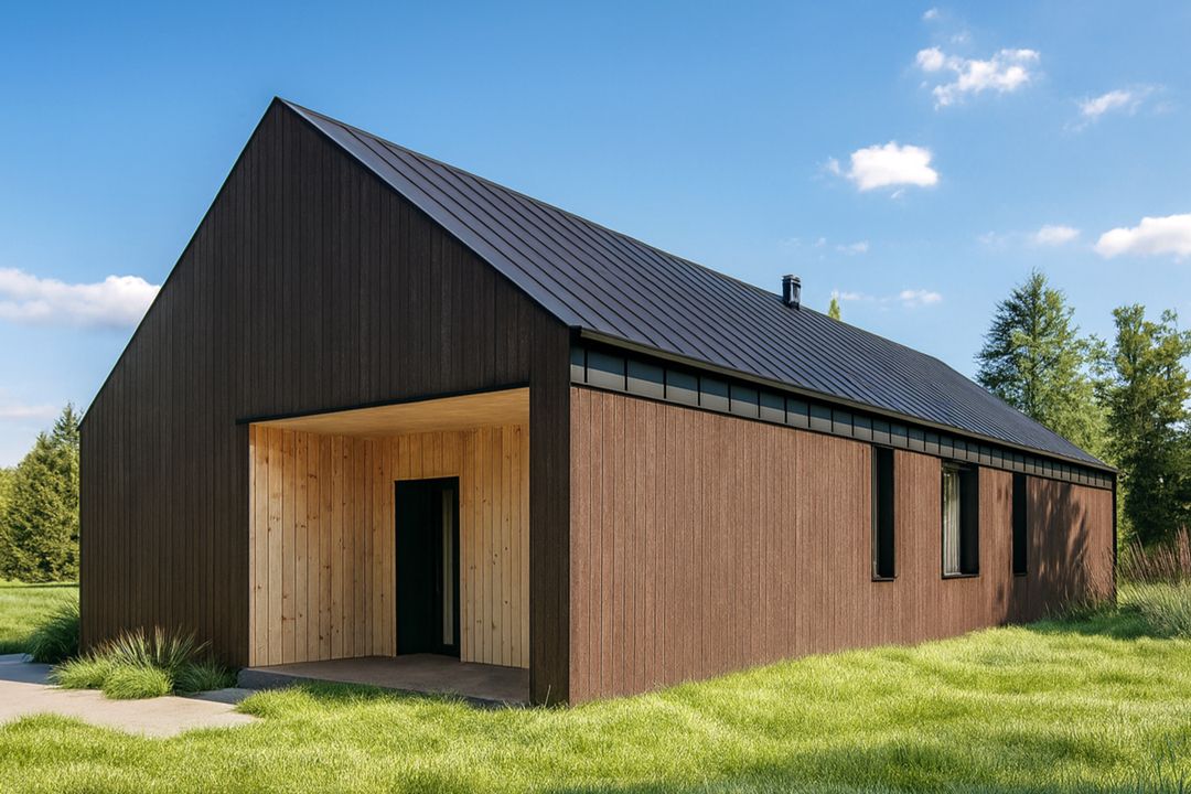 drewno konstrukcyjne C24, wełna mineralna 20cm-25cm, deska elewacyjna;