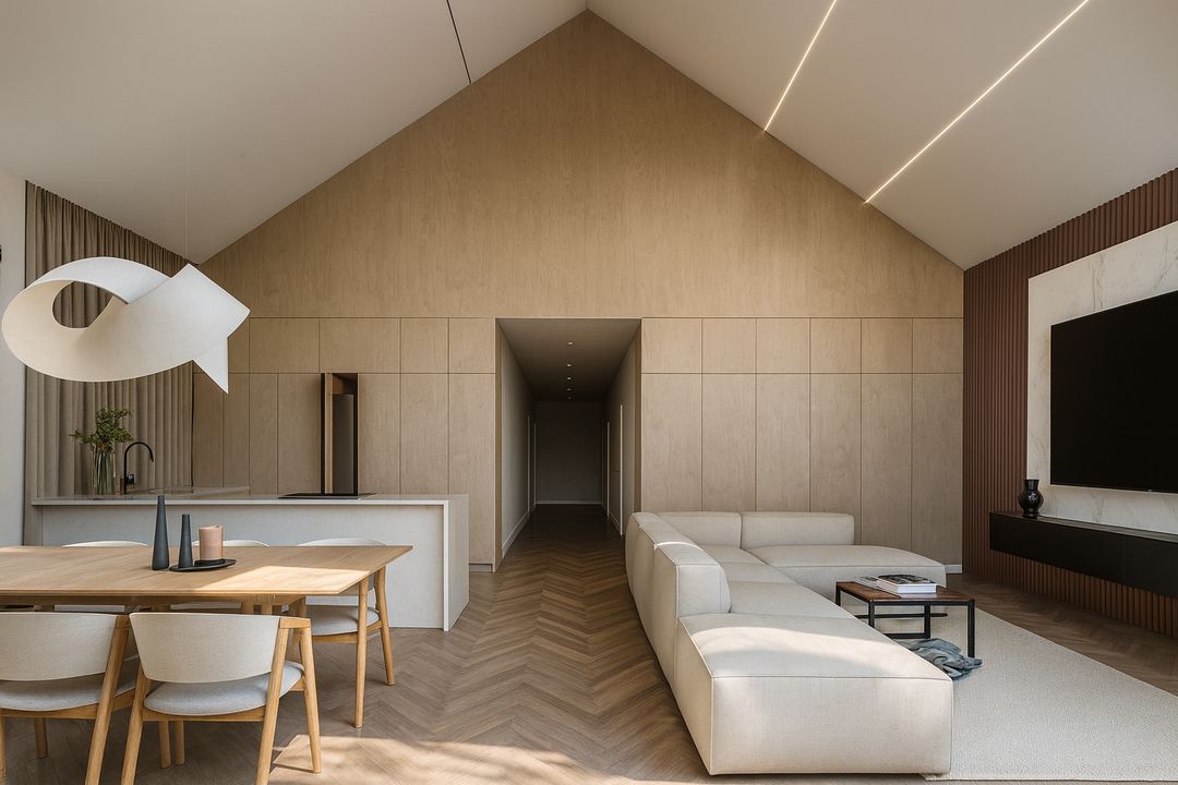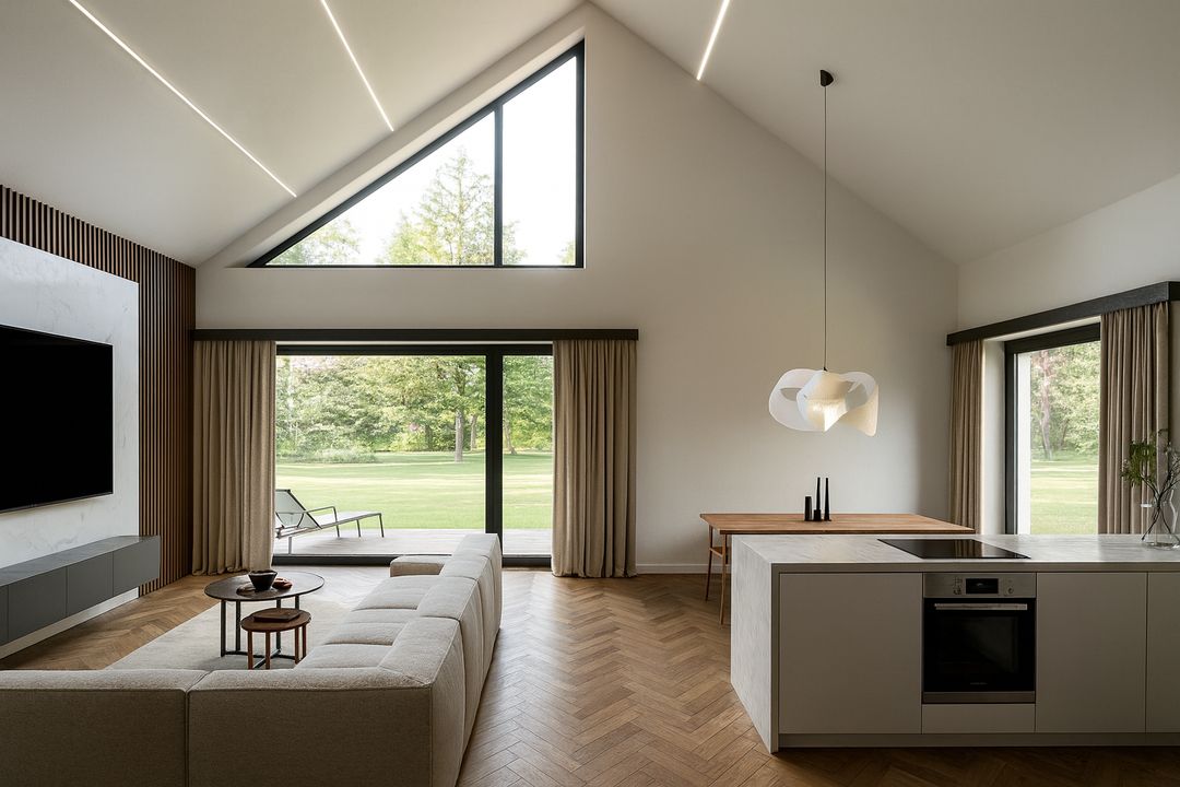 Strefa dzienna to jasny salon z otwartą kuchnią i jadalnią. Otwarty strop i przeszklona ściana szczytowa sprawiają, że wnętrze jest jasne i jeszcze bardziej przestronne.