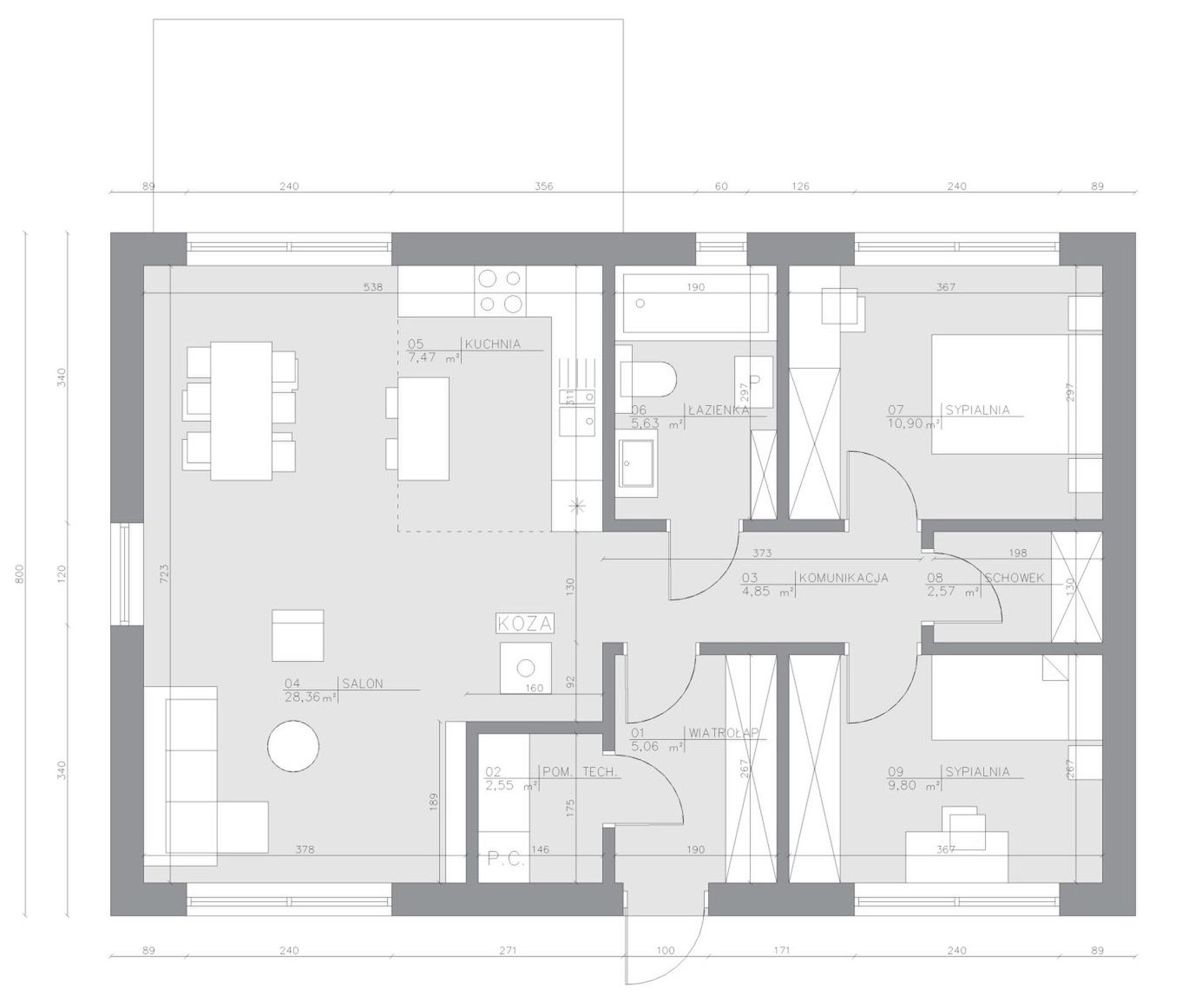 W pełnej wersji domu wykonuje się wszystkie niezbędne instalacje: wodną, elektryczną oraz C.O.