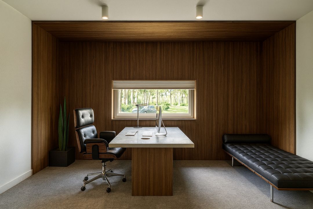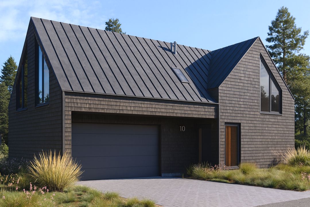 Dom zaprojektowany na planie litery L, z dachem dwuspadowym i licznymi przeszkleniami. Ciemna elewacja nadaje mu skandynawski sznyt.