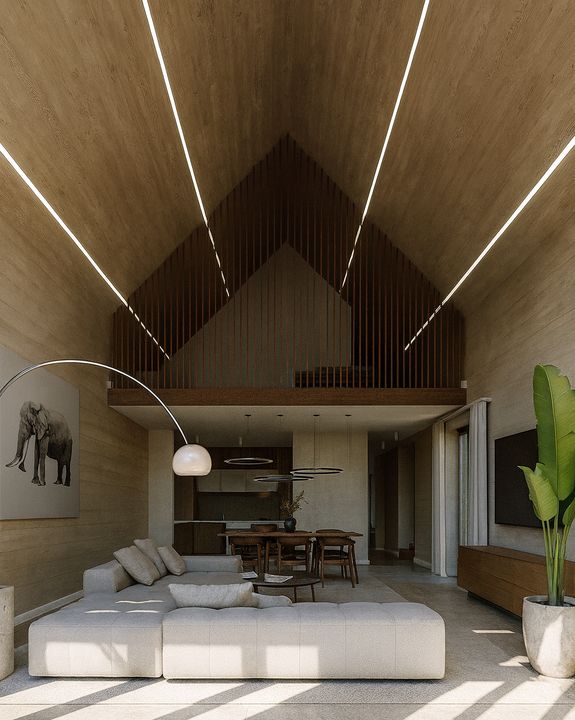 Nad salonem zrezygnowano ze stropu i stworzono antresolę - dodatkowe miejsce wypoczynku.