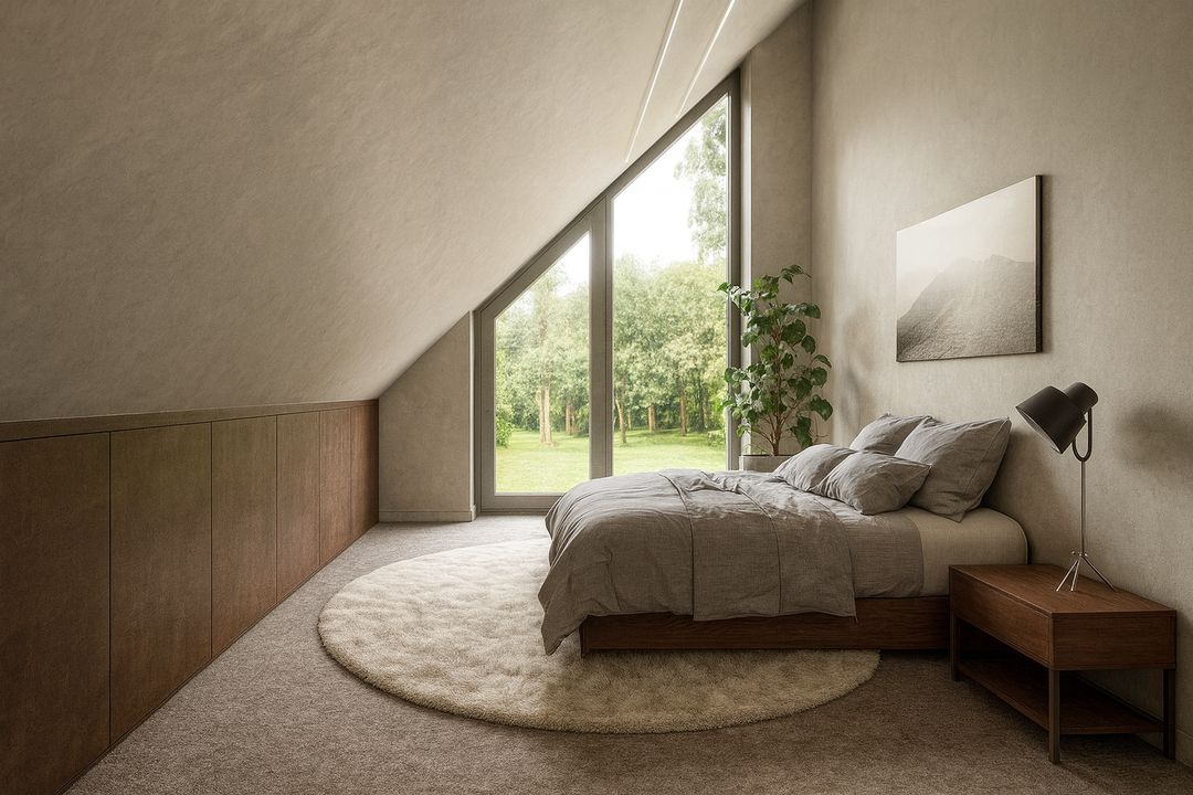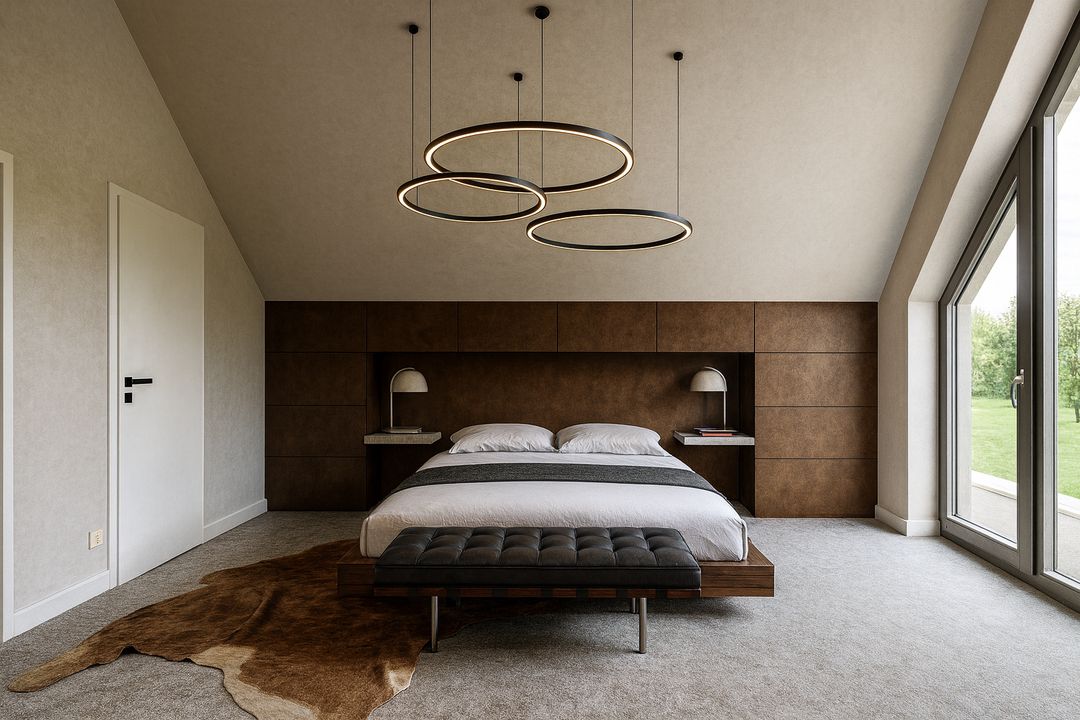 Na górnym poziomie strefę nocną z master bedroom - sypialnią gospodarzy.