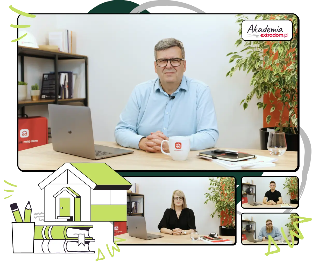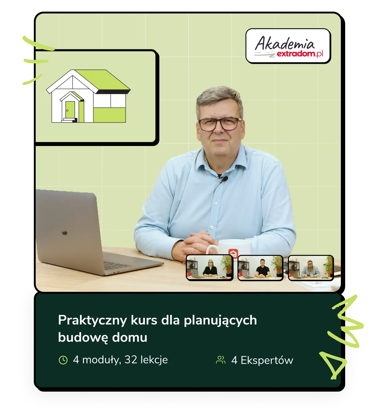 Nasz praktyczny kurs dla planujących budowę domu składa się z 32 lekcji prowadzonych przez 4 ekspertów Extradom.pl Wraz z materiałami wideo otrzymujesz karty pracy i materiały dodatkowe, które pomogą Ci w podjęciu najlepszych możliwych decyzji. To m.in. listy pytań, formularze, checklisty, spis przydatnych linków.