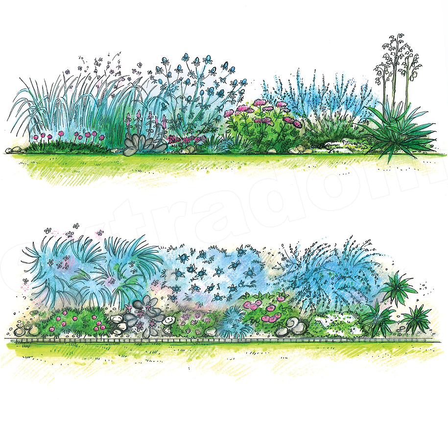 Wydmuchrzyca piaskowa, to ekspansywna, szalenie odporna na suszę, zimozielona trawa o niebieskawych, ostrych liściach. Patrząc na nią od razu przychodzą na myśl nadmorskie krajobrazy, i słusznie, gdyż jest ona powszechnie używana do umacniania wydm. Pozostając w tonacji niebieskiej, tuż obok niej na naszej rabacie zagościł mikołajek płaskolistny. To ogrodowa wersja mikołajka nadmorskiego, doskonała do zastosowania w suchym ogrodzie (mikołajek nadmorski na swoich naturalnych siedliskach podlega ścisłej ochronie gatunkowej). Kolor niebieski świetnie harmonizuje z szarościami czyśćca wełnistego. Jego zimozielone, srebrzyste liście pokryte są miłym w dotyku „futerkiem” – kutnerem. Kwitnie purpurowo od czerwca do sierpnia. Jednak nie wszyscy pozwalają mu zakwitnąć. Ścinają jego kwiatostany, traktując go jako roślinę ozdobną jednie z liści. Z przodu rabaty pojawiła się niska, poduchowata bylina - zawciąg nadmorski. Jej wąskie, zimozielone listki przypominają trawę. Zakwita wiosną tworząc urocze, główkowate różowe lub białe kwiatostany. Dobrze rośnie w pełnym słońcu, a także na piaszczystej glebie.