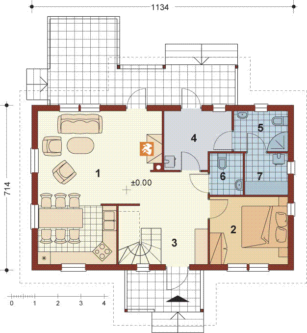 Graficzne opracowanie rzutów poglądowych widocznych na karcie projektu zostało wykonane przez Extradom.pl. Prezentowane przez Extradom.pl wizualizacje wykonane zostały przez autora projektu i należy poczytywać je jedynie za przykład i propozycję wykończenia, wizję architektoniczną autora projektu. Ostateczne wykończenie budynku może nastąpić na wiele sposobów. Szczegółowe rozwiązania zastosowane w oferowanej dokumentacji - w tym również ilość, lokalizacje i wygląd okien, drzwi, kominów - mogą w niewielkim stopniu różnić się od prezentowanej wizualizacji budynku.