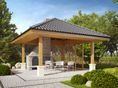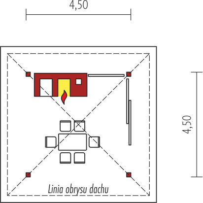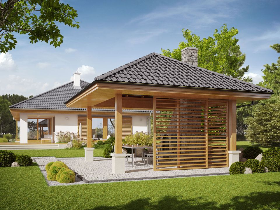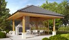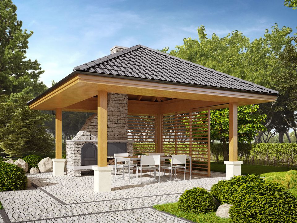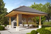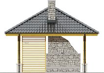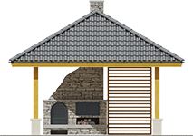 Konstrukcja drewniana, dach pokryty dachówką ceramiczną lub cementową. Grill murowany :Drewno, okładzina kamienna lub klinkierowa, żaluzje drewniane.