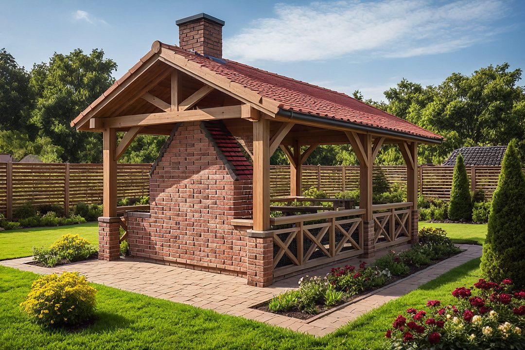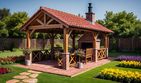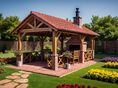Budynek konstrukcji drewnianej. Grill z cegły ceramicznej pełnej. Więźba dachowa dwuspadowa, drewniana, pokryta blachodachówką.