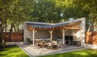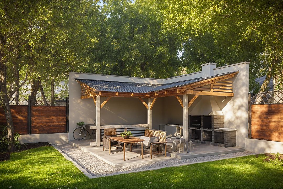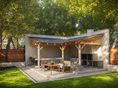 Budynek konstrukcji drewnianej. Ściany murowana z cegły ceramicznej pełnej grubości 25cm. Grill z cegły ceramicznej pełnej. Więźba dachowa dwuspadowa, drewniana, pokryta blachodachówką.