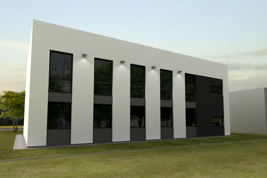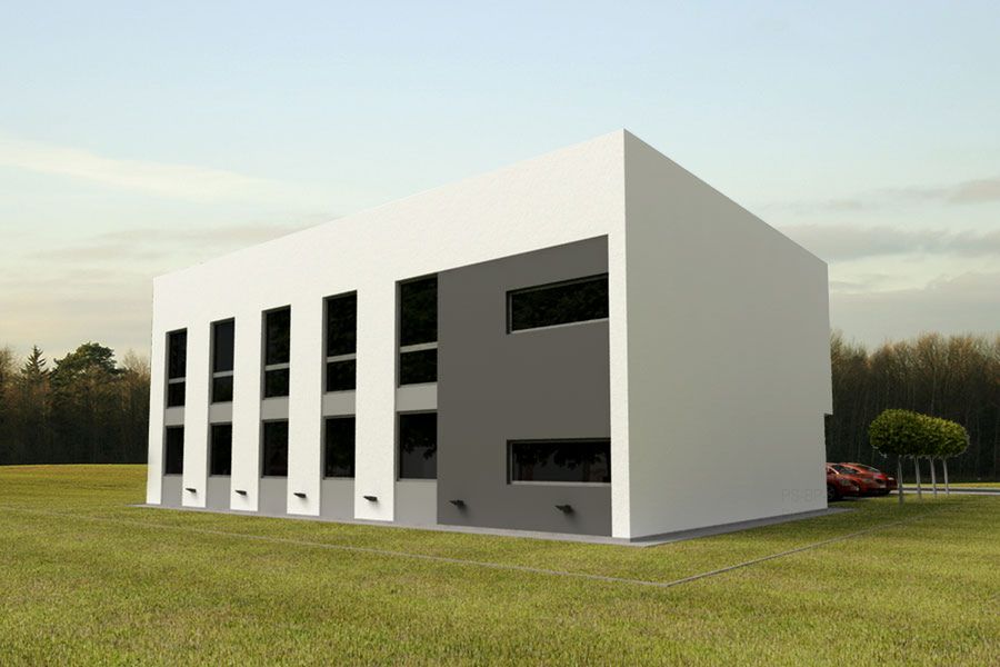Ściany zewnętrzne: ściany w systemie pustaka ceramicznego 18-20 cm, docieplone styropianem 15 cm Fundamenty: betonowe Ściany wewnętrzne: w konstrukcji szkieletowej Strop: monolityczny, żelbetowy Elewacje: pokryte tynkiem strukturalnym Pokrycie dachu: membrana dachowa