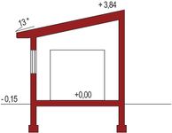 Ściany: bloczek gazobetonowy 24 cm, tynk. Dach: jednospadowy-pulpitowy, więźba drewniana, kąt nachylenia 19 stopni. Ocieplenie dachu: wełna mineralna ISOVER Uni Mata.