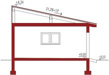 Ściany: bloczek gazobetonowy 24 cm, tynk. Strop: płyty GK podwieszane do pasa dolnego kratownicy drewninej. Dach: jednospadowy-pulpitowy, więźba drewniana kratownicowa, kąt nachylenia 12 stopni. Ocieplenie dachu: wełna mineralna ISOVER Uni Mata.
