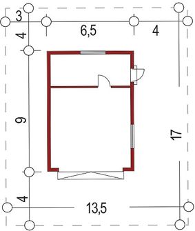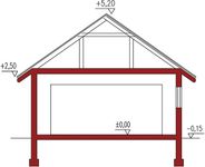 Ściany: bloczek gazobetonowy 24 cm, tynk. Strop: GK podwieszane do pasa dolnego wiązara dachowego. Dach: dwuspadowy, więźba tradycyjna, drewniana, kąt nachylenia 35 stopni ocieplenie stropu: wełna mineralna ISOVER Uni Mata.