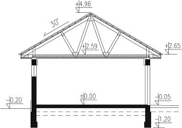Fundamenty betonowe wylewane. Ściany zewnętrzne budynku murowane z bloczków z betonu komórkowego. Stropodach – lekkie wiązary drewniane. Pokrycie – dachówka, blacha dachówkowa lub gont papowy. Stolarka typowa, drewniana lub z PCV.