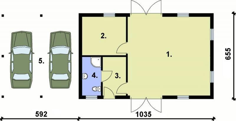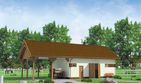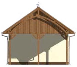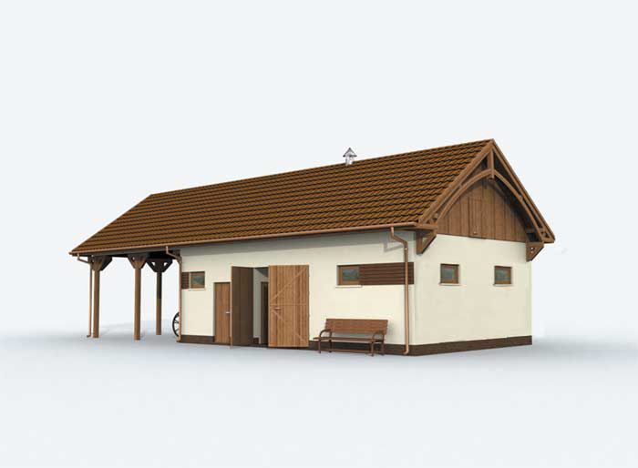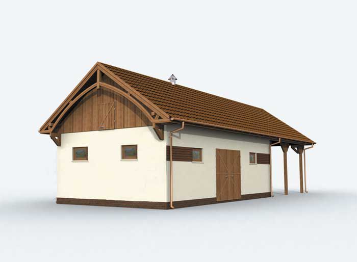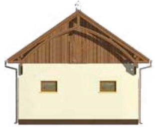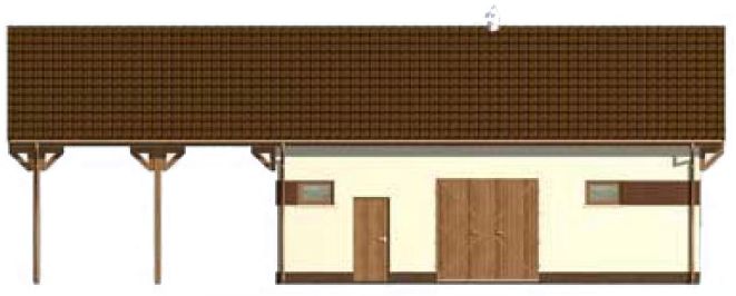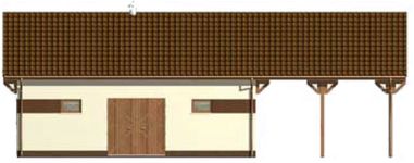 Wymiar bramy 2,5m x 2,5m. Ściany zewnętrzne murowane grubości 25 cm. Ściany wewnętrzne działowe murowane grubości 12 cm. Wszystkie ściany wykonane z pustaków ceramicznych "POROTHERM". Dach pokryty dachówką ceramiczną: konstrukcja dachu. Wiązary drewniane.