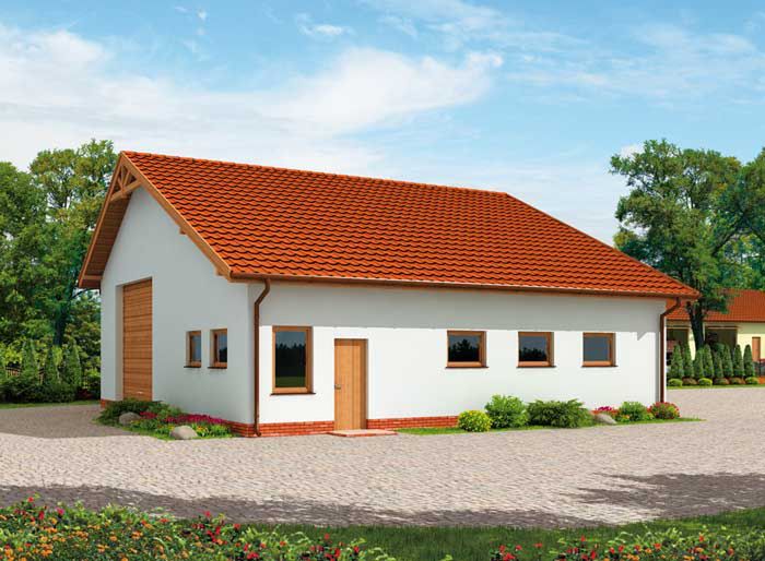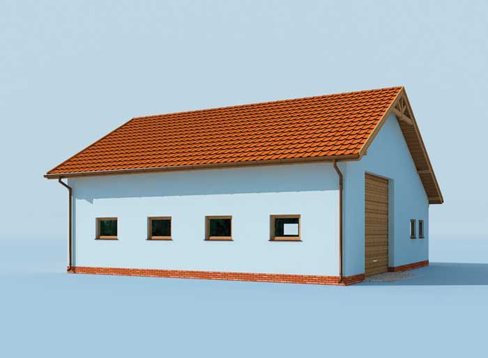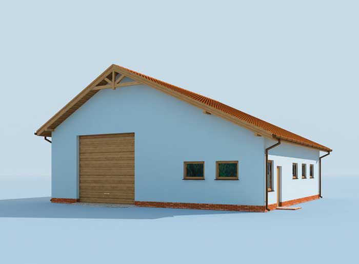 Technologia tradycyjna: ściany zewnętrzne nośne murowane grubości 25cm, wszystkie ściany wykonane z pustaków ceramicznych "POROTHERM", więźba dachowa drewniana, pokrycie dachu: dachówka ceramiczna, wymiar bram garażowych 2 x 4,2 x 4,0m i 1 x 3,0 x 3,0m.