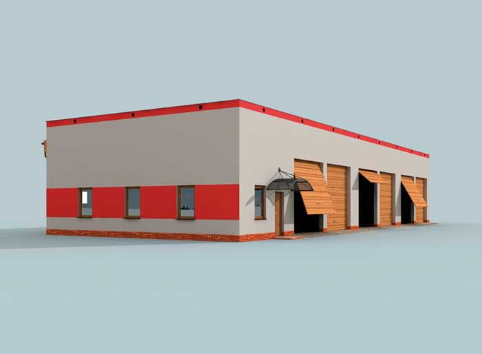 Technologia tradycyjna :- powierzchnia użytkowa -345,10m2 - powierzchnia zabudowy -372,60m2 - powierzchnia całkowita -372,60m2 - kubatura -1990,00m3- ściany zewnętrzne nośne murowane grubości 25cm - wszystkie ściany wykonane z pustaków ceramicznych "POROTHERM" - wysokość budynku 5,98m - dach jednospadowy 3° - więźba dachowa drewniana - pokrycie dachu papa termozgrzewalna - wymiar bram garażowych 3,5x3,8m