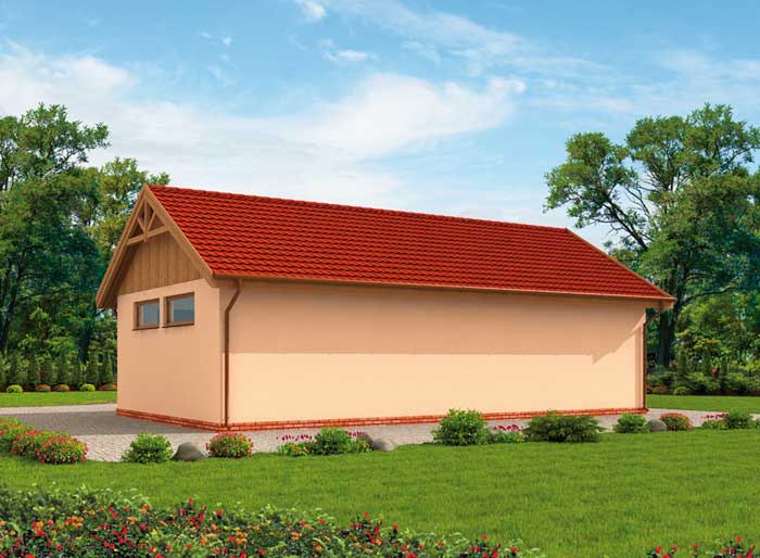 Technologia tradycyjna: ściany zewnętrzne nośne murowane grubości 25cm, wszystkie ściany wykonane z pustaków ceramicznych "POROTHERM", więźba dachowa drewniana, pokrycie dachu dachówka cementowa bądź ceramiczna, wymiar bram garażowych 2 x 2,6 x 2,8m 1 x 2,8 x 2,8m