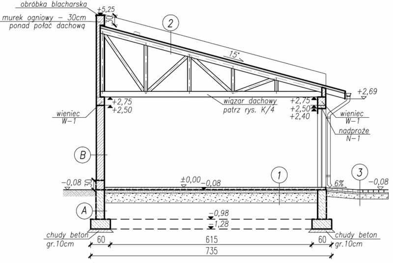 Technologia tradycyjna :- powierzchnia użytkowa 112,15m2 - powierzchnia zabudowy -127,61m2 - powierzchnia całkowita -127,61m2 - kubatura brutto -252,00m3 - ściany zewnętrzne nośne murowane grubości 25cm - wszystkie ściany wykonane pustaków ceramicznych "POROTHERM" - wysokość budynku 5,33m - dach jednospadowy 15° - więźba dachowa drewniana - pokrycie dachu papa- wymiar bramy garażowej 2,4x2,4m