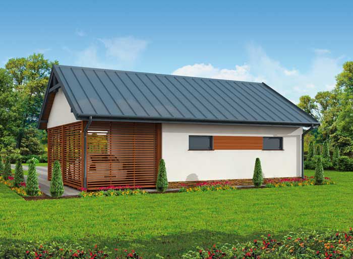 Technologia tradycyjna :- powierzchnia użytkowa przyziemia -67,39m2 - powierzchnia zabudowy budynk -56,45m2 - powierzchnia całkowita -67,39m2 - kubatura -298,00m3 - ściany zewnętrzne nośne murowane grubości 25cm - wszystkie ściany wykonane pustaków ceramicznych "POROTHERM" - wysokość budynku 5,37m - dach dwuspadowy 30° - więźba dachowa drewniana - pokrycie dachu panel dachowy na rąbek - wymiar bramy garażowej 2,4x2,4m