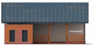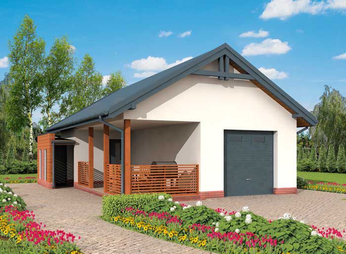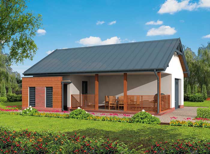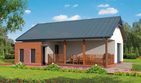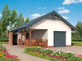 Technologia tradycyjna :- powierzchnia użytkowa budynku -47,21m2 - powierzchnia użytkowa werandy -16,65m2 - powierzchnia zabudowy budynku -76,75m2 - powierzchnia całkowita -76,75m2 - kubatura części otwartej -278,74m3 części zamkniętej -46,44m3- kubatura razem -325,18m3 - ściany zewnętrzne nośne murowane grubości 25cm - wszystkie ściany wykonane pustaków ceramicznych "POROTHERM" - wysokość budynku 5,33m - dach dwuspadowy 30° - więźba dachowa drewniana - pokrycie dachu blacha lub blachodachówka - wymiar bramy garażowej 2,4x2,4m