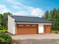 Technologia tradycyjna. Ściany zewnętrzne nośne murowane grubości 25 cm. Wszystkie ściany wykonane z pustaków ceramicznych "POROTHERM". Więźba dachowa drewniana. Pokrycie dachu panele dachowe na rąbek. Wymiar bramy garażowej 5,0x2,4 m.