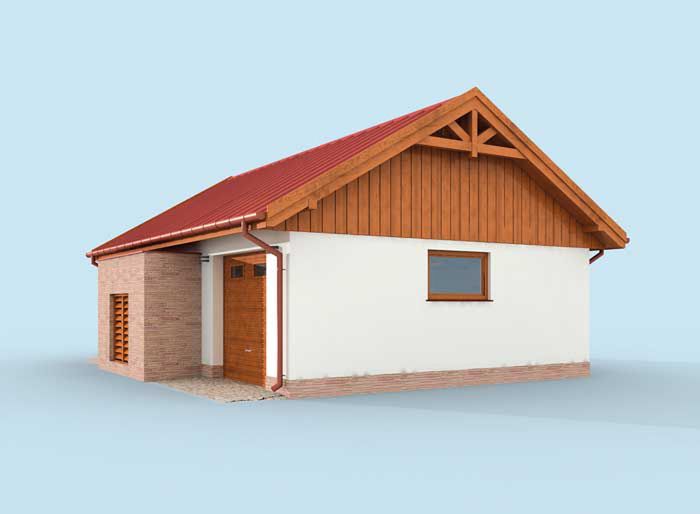 Technologia tradycyjna :- powierzchnia użytkowa -62,52m2 - powierzchnia zabudowy -75,13m2 - powierzchnia całkowita -75,13m2 - kubatura - 321,00m3 - ściany zewnętrzne nośne murowane grubości 25cm - wszystkie ściany wykonane z pustaków ceramicznych "POROTHERM" - wysokość budynku 5,29m - dach dwuspadowy 30°, nad składem odpadów i drewna dach jednospadowy 2° - więźba dachowa drewniana - pokrycie dachu 30°- stalowe panele dachowe, 2°- gonty bitumiczna lub papa - wymiar bramy garażowej 2,4x2,4m